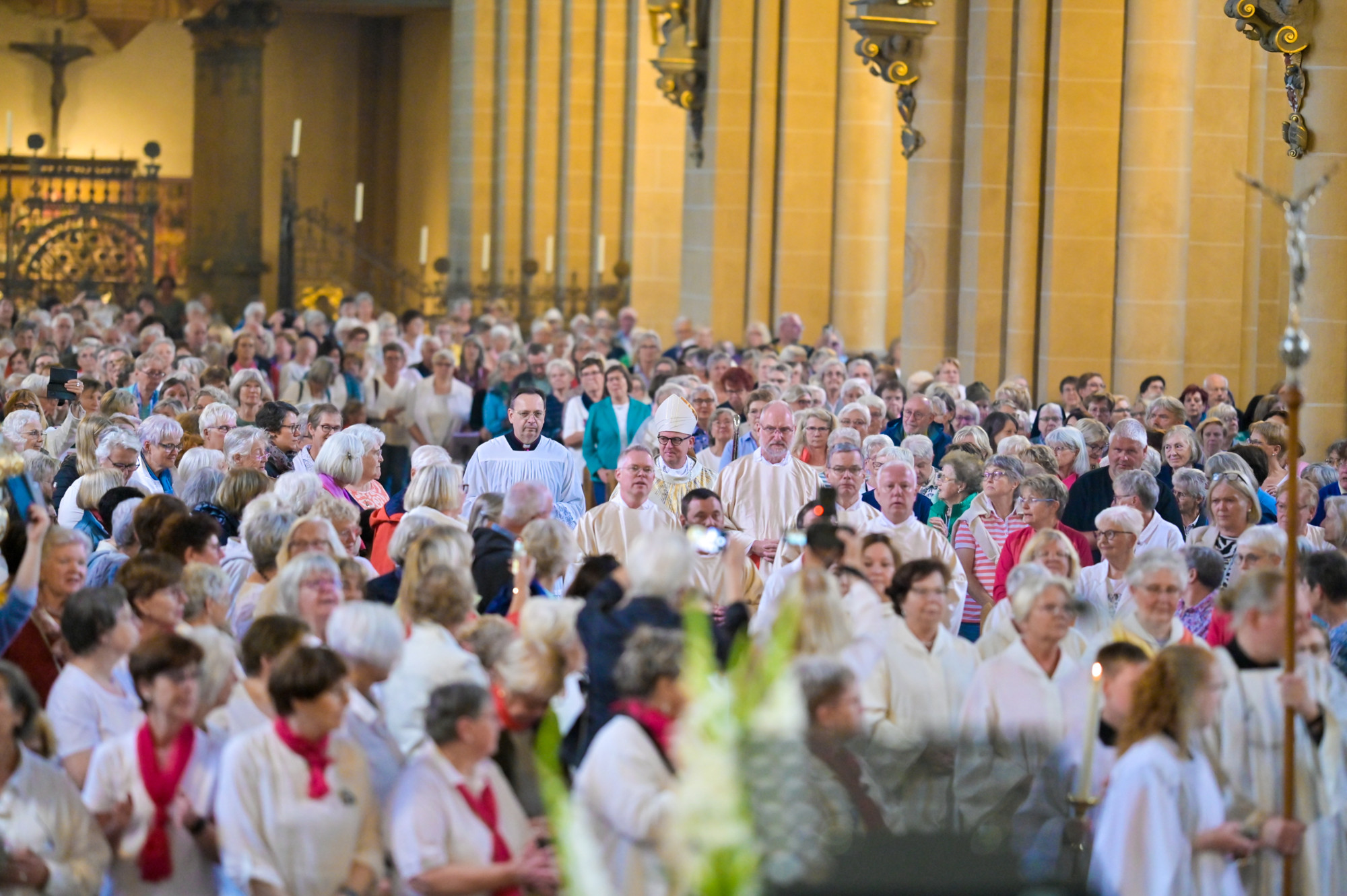 Die Sitzbänke im Paderborner Dom waren schon lange vor Beginn des Pontifikalamtes dicht gefüllt. Viele waren in weißer Kleidung gekommen – als Zeichen der Erneuerung im Kontext der Synodalität. Der Gottesdienst, der liturgisch vor allem von der kfd gestaltet wurde, lebte von der liebevollen musikalischen Gestaltung durch den newFaces-Chor aus der Kirchengemeinde St. Michael in Oerlinghausen. Im Vordergrund stand aber vor allem der gemeinsame Dialog über das, was Glaube, Gemeinschaft und Engagement ausmacht – und über Wünsche und Hoffnungen fürs Morgen.