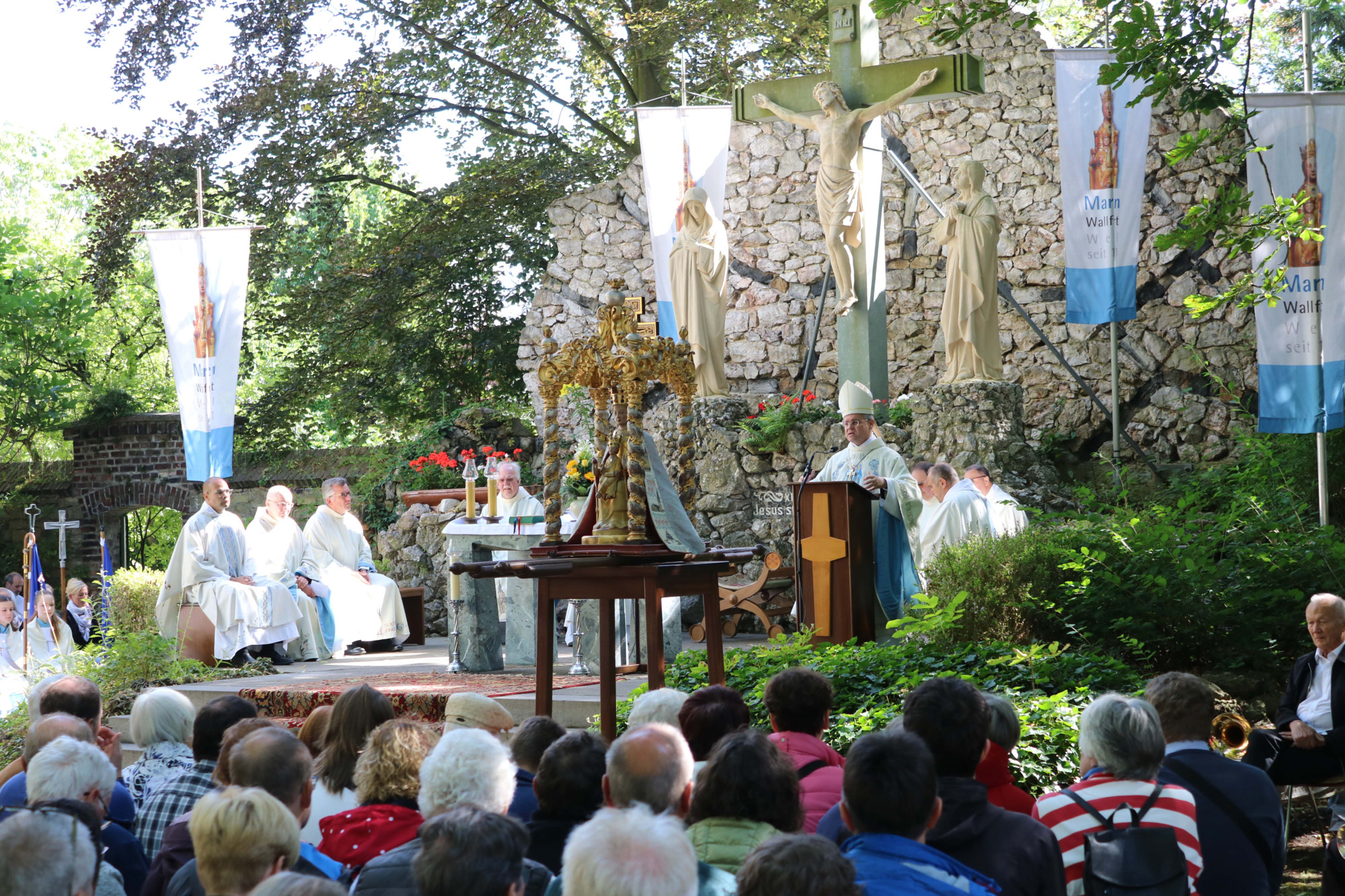 Das Pontifikalamt zum Patronatsfest feierte der neue Paderborner Erzbischof Dr. Udo Markus Bentz nach der Verabschiedung der Pilgergruppe Warstein auf dem Kreuzwegplatz neben der Wallfahrtsbasilika. Mehrere hundert Gläubige hatten sich unter dem Schatten mächtiger Bäume zur Gottesdienstfeier versammelt. Neben dem perfekten Wetter trug zum großen Zuspruch sicher auch die Neugier auf den neuen Erzbischof bei. Erzbischof Dr. Udo Markus Bentz wurde mit freundlichen Worten vom Wallfahrtsleiter Pastor Dr. Gerhard Best willkommen geheißen. Der Seelsorger verdeutlichte in seinem Grußwort, dass Wallfahrten immer auch zu guten Begegnungen beitragen und damit wichtiger denn je sind.