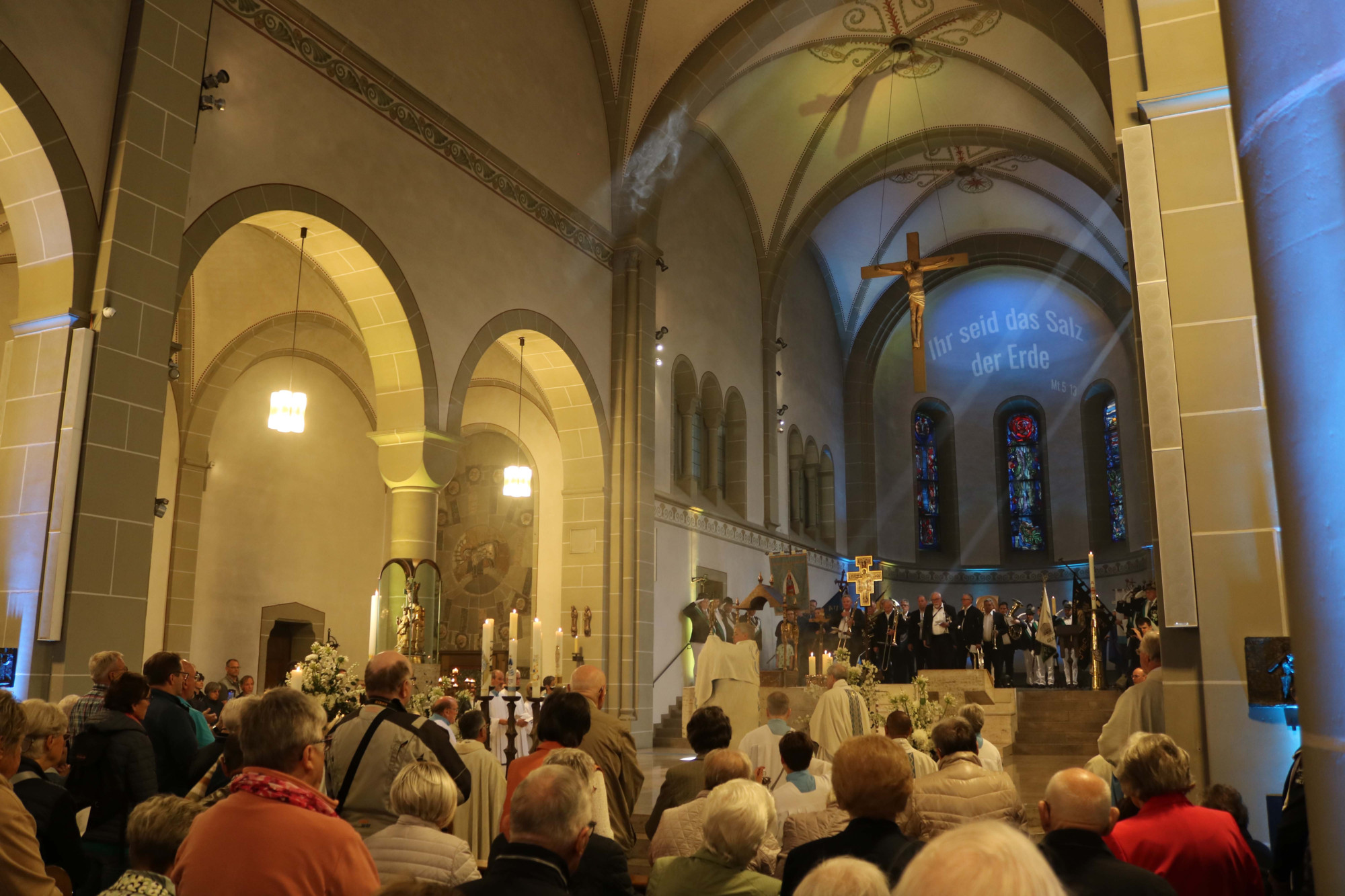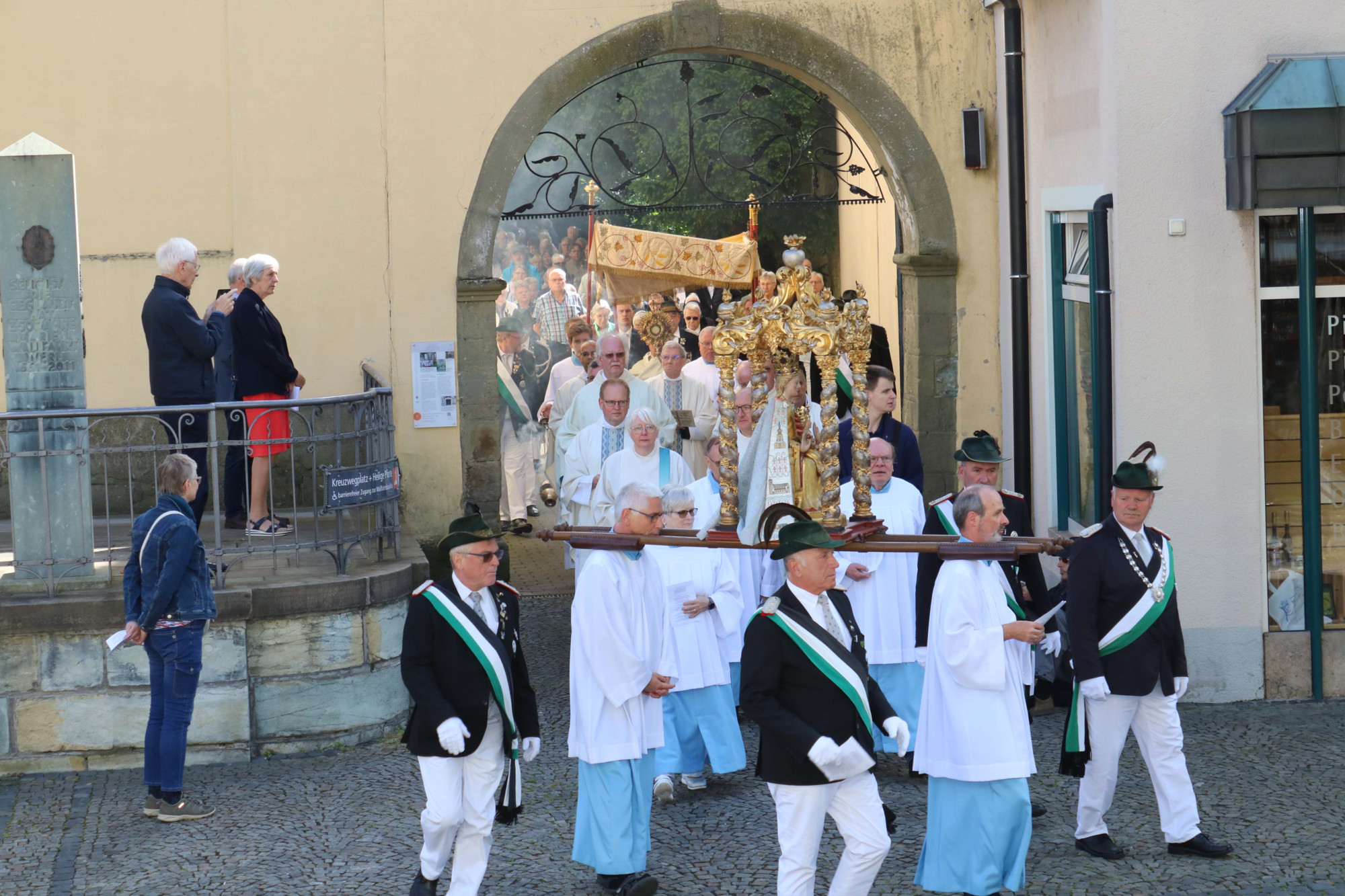 Die anschließende Sakramentsprozession verweilte an der Segens-Station neben der Propsteikirche St. Walburga. Das Gnadenbild im Zentrum führte der Weg die Menschen durch die Werler Innenstadt und wieder zurück in die prächtig geschmückte und dezent beleuchtetet Basilika.Unter großer Anteilnahme gab es schließlich den feierlichen Abschluss in der Wallfahrtsbasilika mit Te Deum und Sakramentalem Segen.Hier sorgte die Bläsergruppe Altenessen, die bereits das Pontifikalamt musikalisch begleitet hatte, für ein eindrucksvolles Raum-Klangerlebnis. Dieses wurde durch einen Dudelsack-Spieler auf der Orgel-Empore vervollkommnet und ein langer Schlussapplaus rundete den Wallfahrts-Mittag ab.
