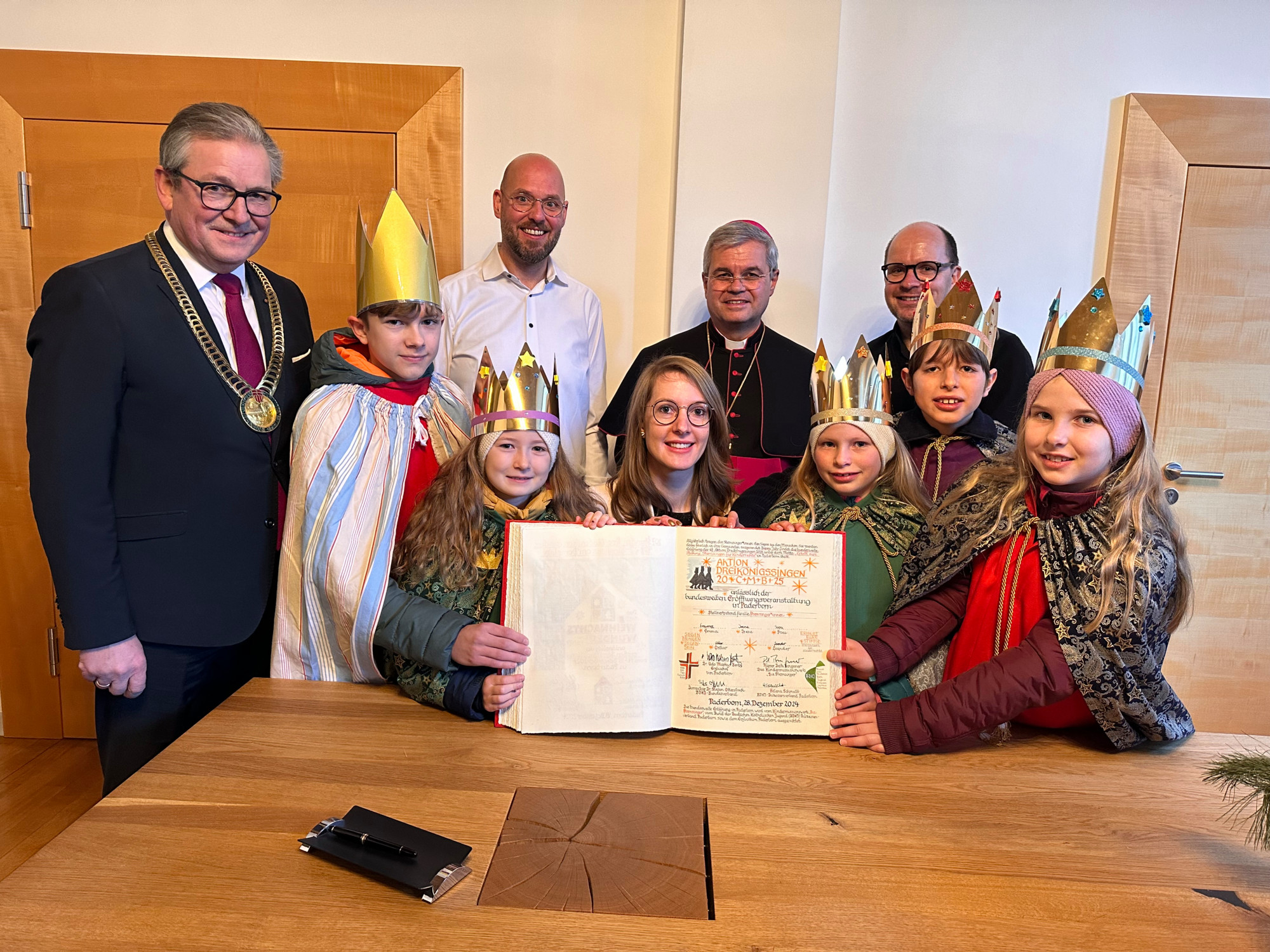 Dann wurde es noch einmal richtig laut auf dem Rathausplatz, denn die 1.500 Sternsingerinnen und Sternsinger erhoben ihre Stimmen lautstark für Kinderrechte und sangen gemeinsam das Lied „Stern über Bethlehem“. Im Anschluss trugen sich die Sternsingerinnen und Sternsinger Emma, Irene, Svea, Oskar und Leander, Erzbischof Dr. Udo Markus Bentz, Pfarrer Dirk Bingener, Präsident des Kindermissionswerkes „Die Sternsinger“, Domvikar Dr. Stefan Ottersbach, BDKJ Bundespräses, und Helena Schmidt, BDKJ-Diözesanseelsorgerin, in das Goldene Buch der Stadt Paderborn ein.