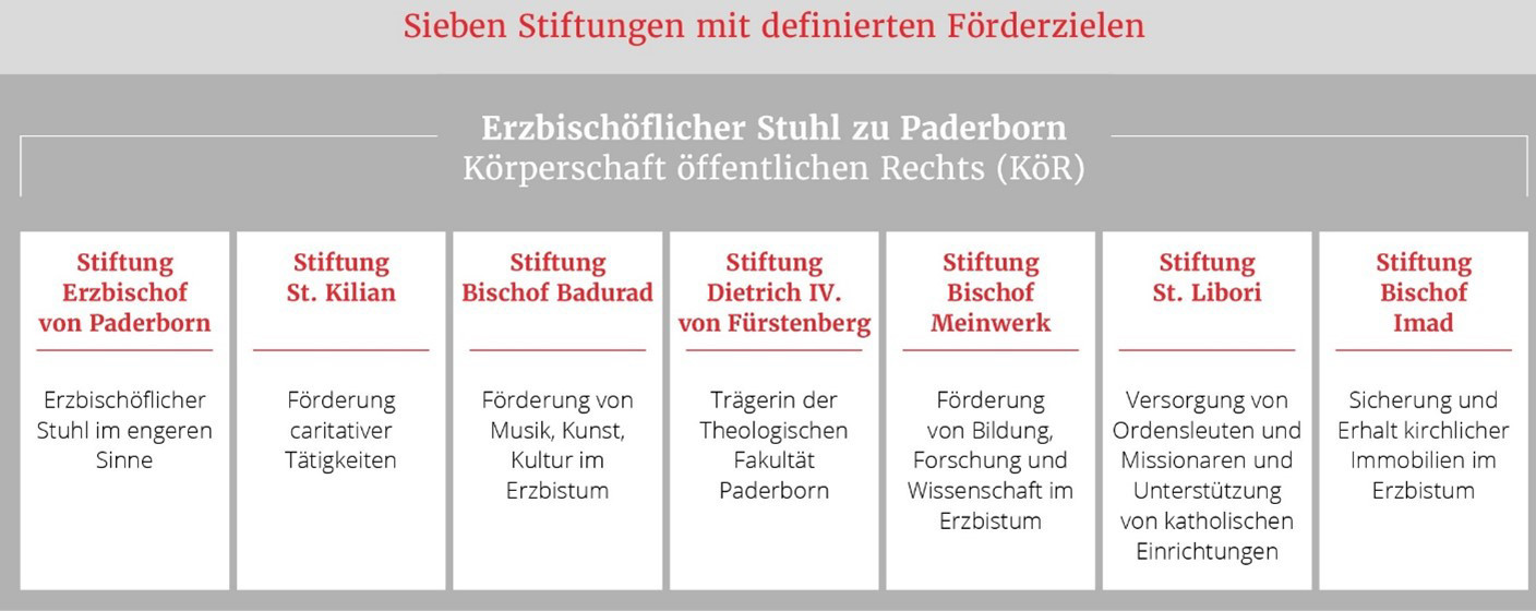 Der Erzbischöfliche Stuhl zu Paderborn legt in seinem Finanzbericht 2024 zum sechsten Mal umfassende Informationen über seine Aufgaben und Tätigkeiten vor. Die Körperschaft öffentlichen Rechts (KöR) umfasst sieben Stiftungen mit unterschiedlichen Zwecken beziehungsweise Förderschwerpunkten. Dazu gehören die Stiftung Erzbischof von Paderborn (der Erzbischöfliche Stuhl im engeren Sinne) und die Stiftung Dietrich IV. von Fürstenberg als Trägerin der Theologischen Fakultät sowie fünf weitere Stiftungen, die Fördermittel vor allem für karitative Aufgaben, Bildung und Kultur vergeben oder Sicherungsaufgaben übernehmen.