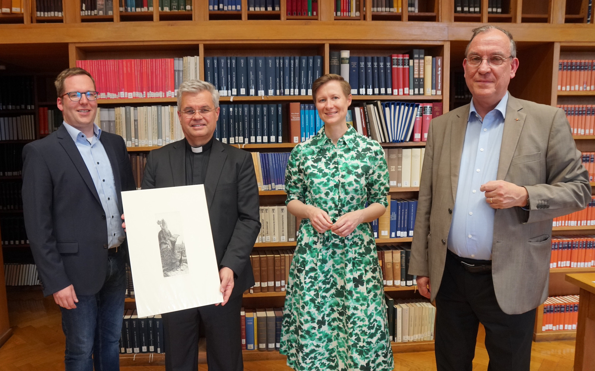 „Die tief verwurzelte Verehrung des Liborius in Paderborn ist ein erstaunliches Phänomen, und ich freue mich sehr auf das anstehende Libori-Fest“, so der neue Paderborner Erzbischof. Zum Abschluss überreichte ihm Professor Stork einen Kupferstich der italienischen Künstlerin und Professorin der Akademie der schönen Künste in Florenz, Carla Fusi, die den Heiligen Liborius zeigt. Dieser werde nun einen besonderen Platz im Paderborner Bischofshaus finden, so Erzbischof Dr. Bentz.