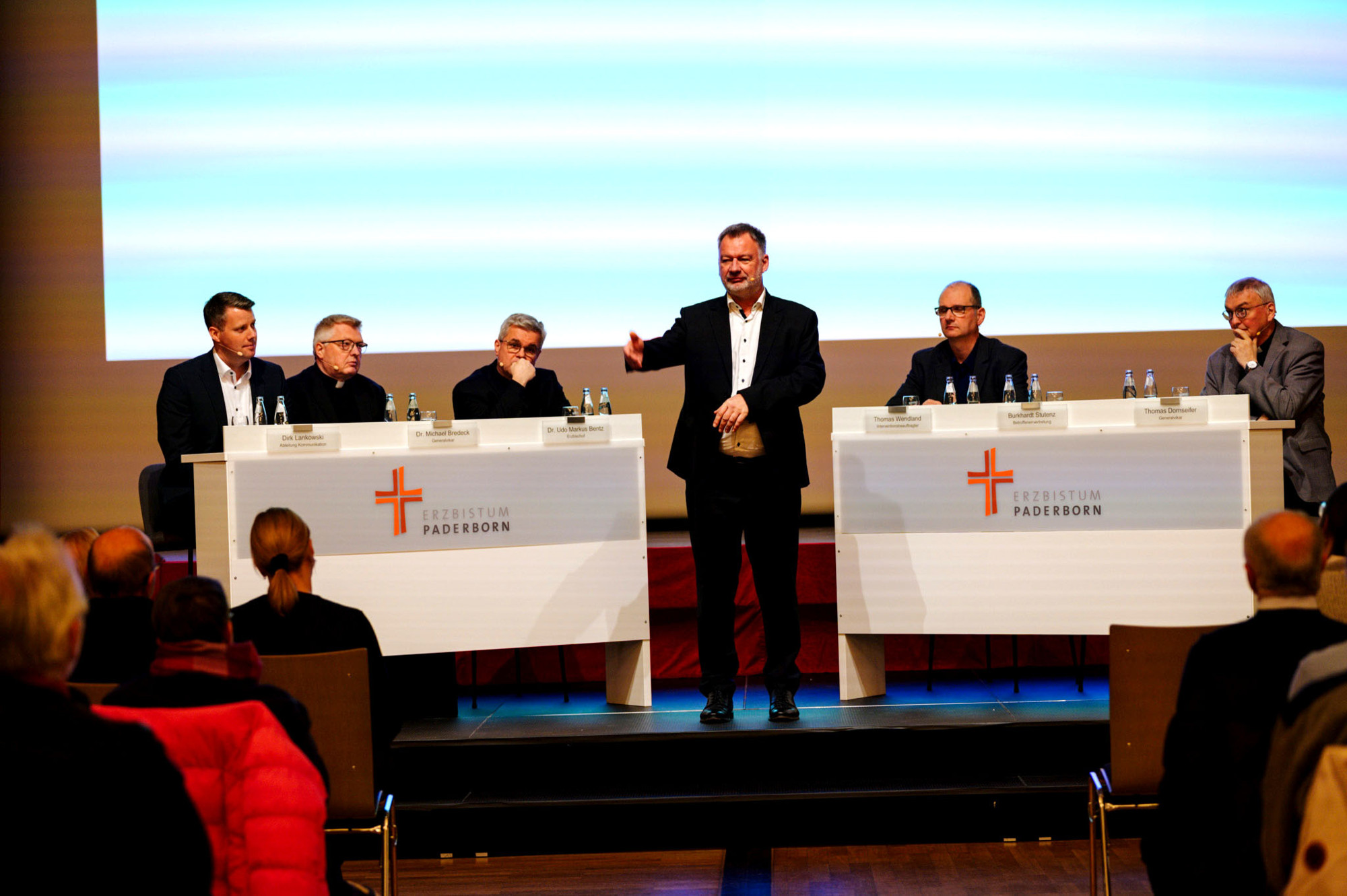 Erzbischof Dr. Udo Markus Bentz, die Generalvikare Thomas Dornseifer und Dr. Michael Bredeck, der Interventionsbeauftragte Thomas Wendland sowie Mitglieder der Betroffenenvertretung stellten sich den Fragen der Teilnehmenden und suchten bewusst den direkten Dialog. Ziel war es, Raum auch für sehr persönliche Rückmeldungen zu schaffen und die unterschiedlichen Perspektiven wahrzunehmen. Zugleich wurde deutlich, dass die Aufarbeitung nicht mit der Veröffentlichung der Studie abgeschlossen ist, sondern als fortlaufender Prozess verstanden wird.