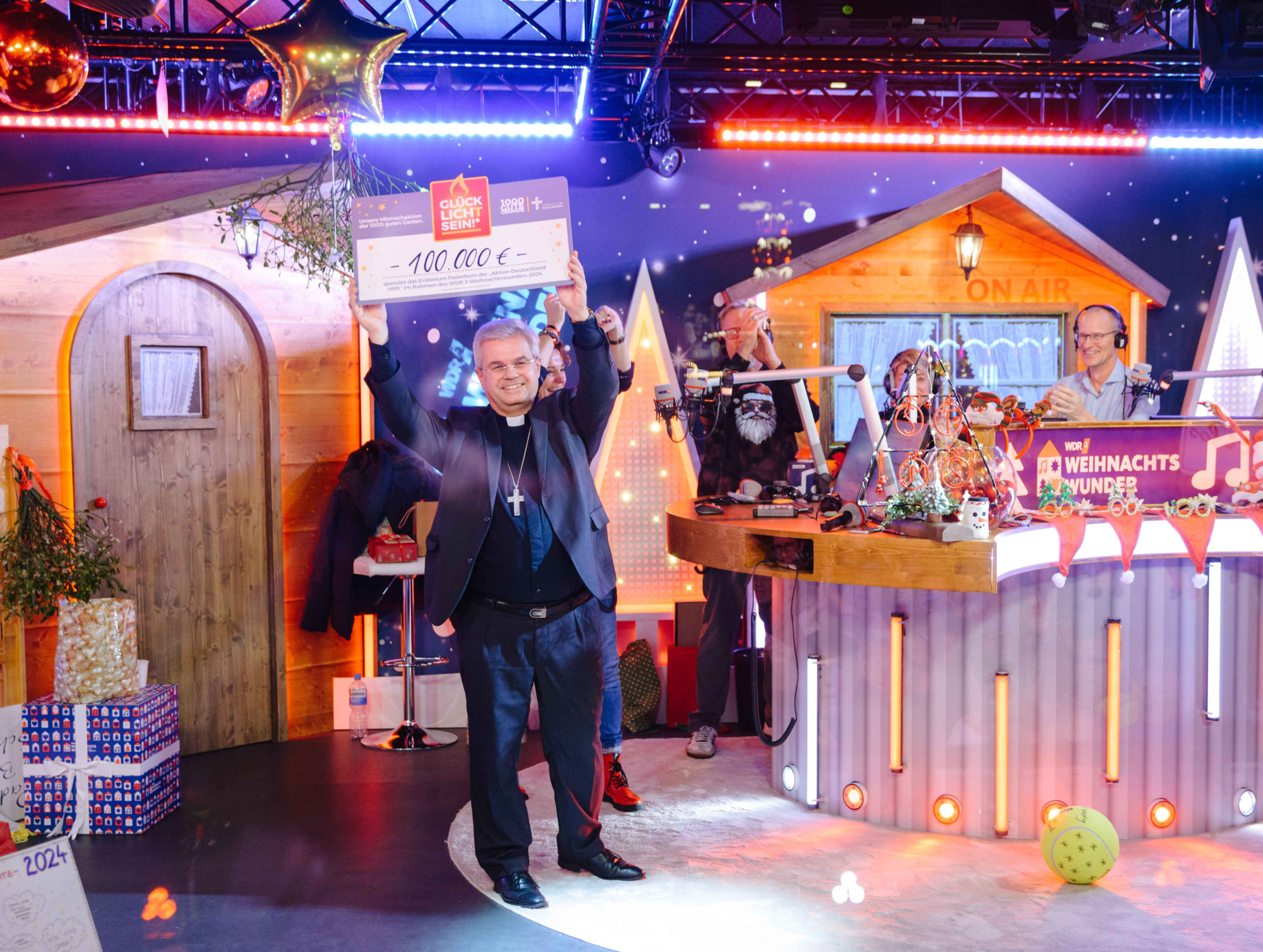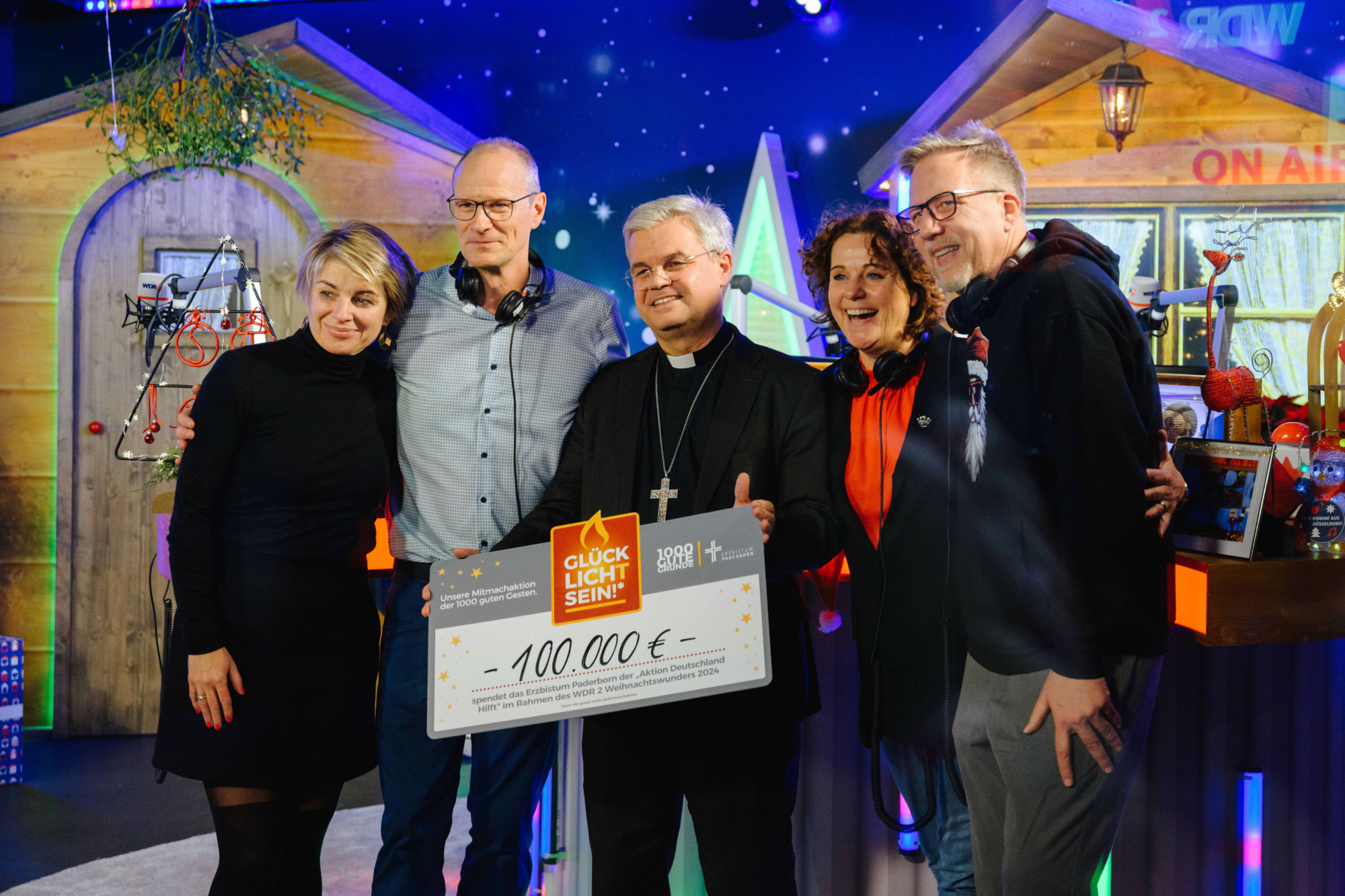 Erzbischof Dr. Udo Markus Bentz hat einen Spendenscheck über 100.000 Euro beim gläsernen Sendestudio des WDR 2 Weihnachtswunders überreicht – und mit der ersten sechsstelligen Spendensumme des diesjährigen Weihnachtswunders für begeisterte Sprachlosigkeit beim Moderationsteam gesorgt. Mit der Spende löste das Erzbistum Paderborn das Versprechen aus seiner Mitmachaktion GLÜCKLICH/T SEIN! ein: Im Aktionszeitraum vom 25. Oktober bis zum Nikolaustag am 6. Dezember haben viele Menschen im ganzen Erzbistum gemeinsam mit vielen kleinen Gesten über 100.000 Glücksmomente geschaffen. Das Erzbistum hatte für diese Gemeinschaftsleistung eine Spende von 100.000 Euro an das Weihnachtwunder zugesagt.