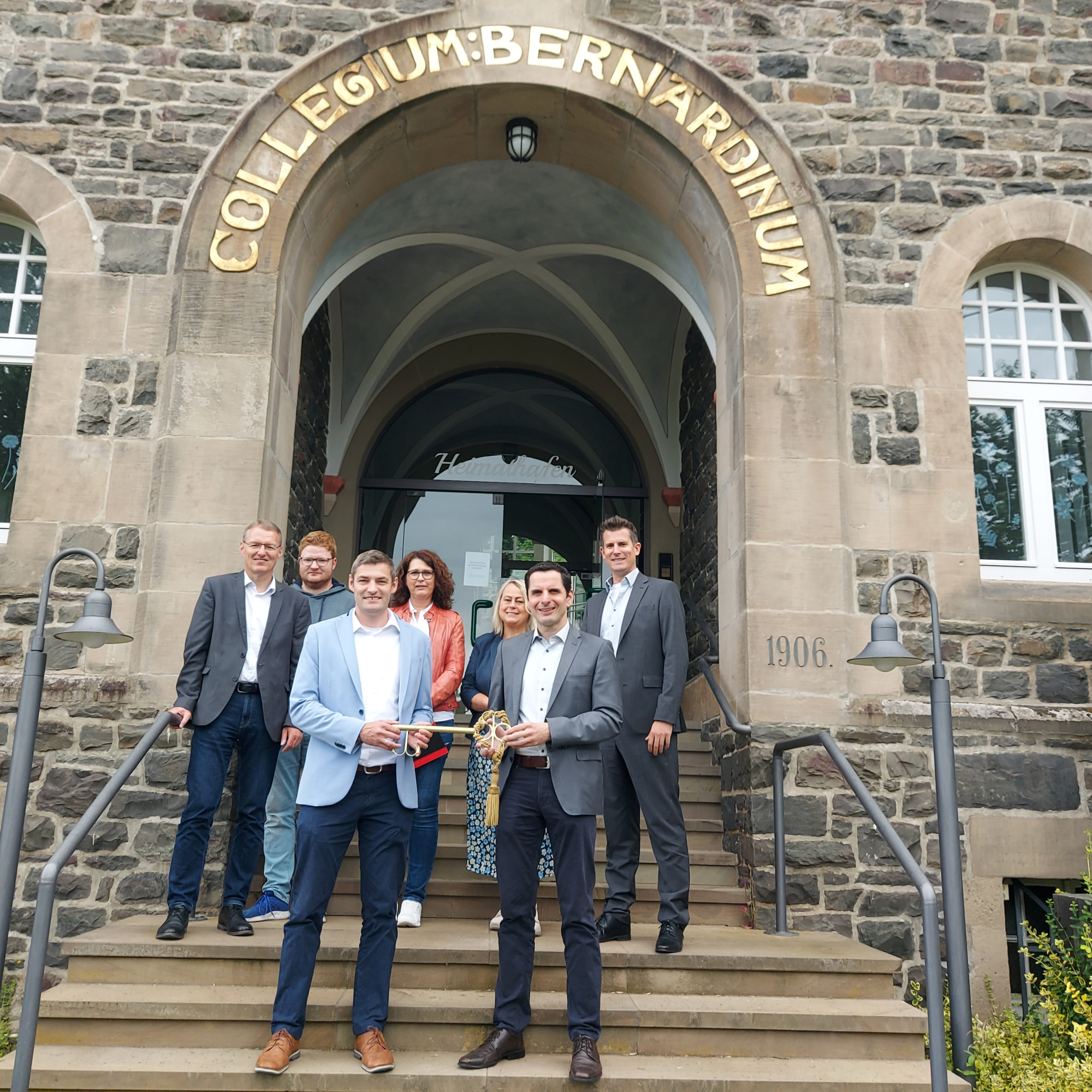 Der Schlüssel ist übergeben und der Verkauf des ehemaligen Collegium Bernardinums damit endgültig vollzogen. Nachdem die Stadt Attendorn im vergangenen Jahr den Zuschlag erhalten hatte, ist Wolfgang Mönnikes, Leiter des Teams Baufinanzierung und Liegenschaften im Erzbischöflichen Generalvikariat, jetzt nach Attendorn gereist, um die Immobilie des Erzbistums an die Stadt Attendorn zu übergeben.