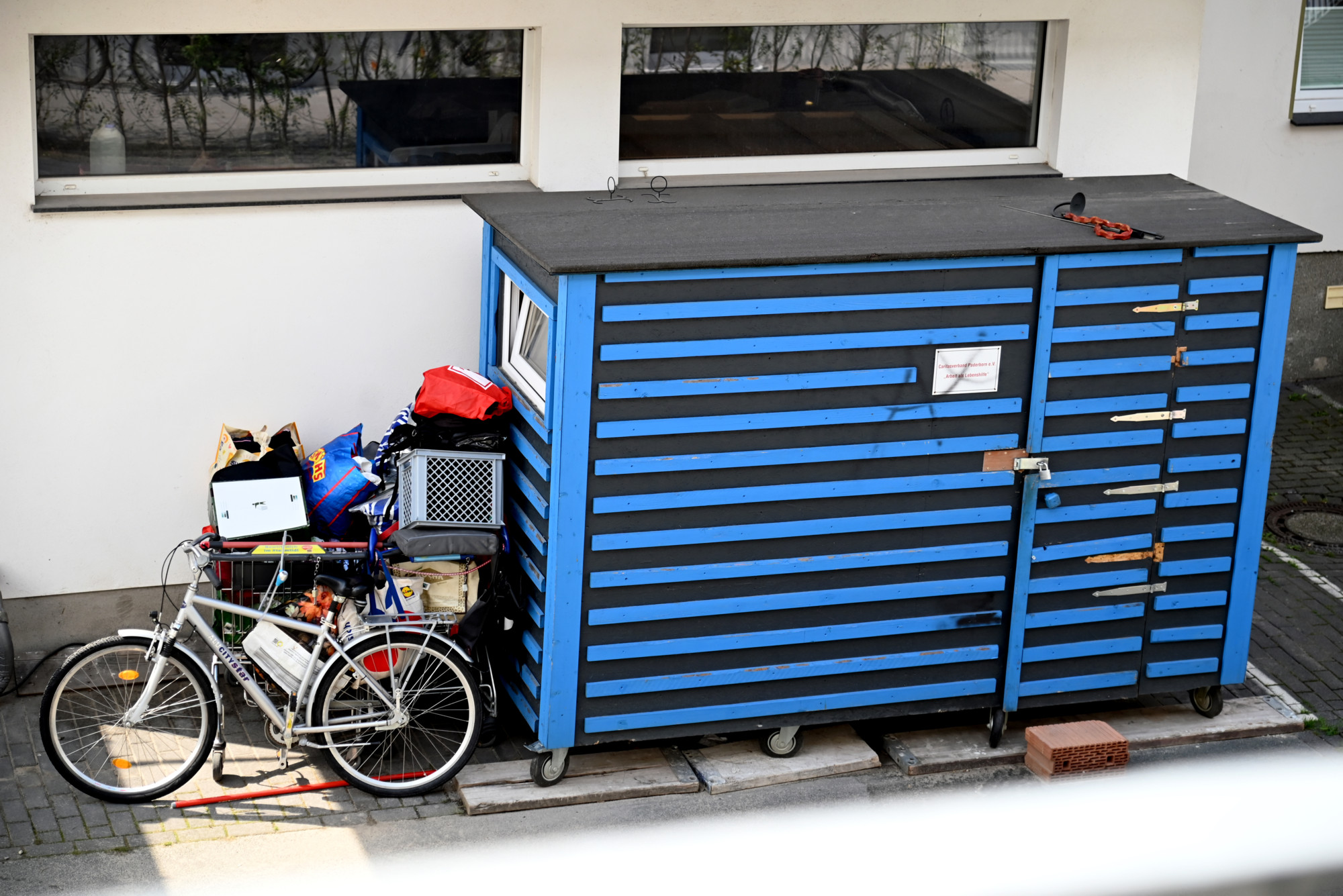 Die Wände aus Holz, Teerpappe auf dem Dach, ein kleines Fenster, eine Tür mit einem Vorhängeschloss – im Inneren ist Platz für eine Matratze, ein bisschen Stauraum, ein Erste-Hilfe-Set und einen Feuerlöscher. Draußen an der Schmalseite stehen eine Klappkiste und eine Reihe Plastiktüten, an die ein Fahrrad gelehnt ist. Hier hat offensichtlich jemand eine Zuflucht gefunden, der sonst irgendwo im Freien übernachten müsste. Es handelt sich dabei aber nicht um einen improvisierten Bretterverschlag, sondern eine sogenannte „Wohnbox“.