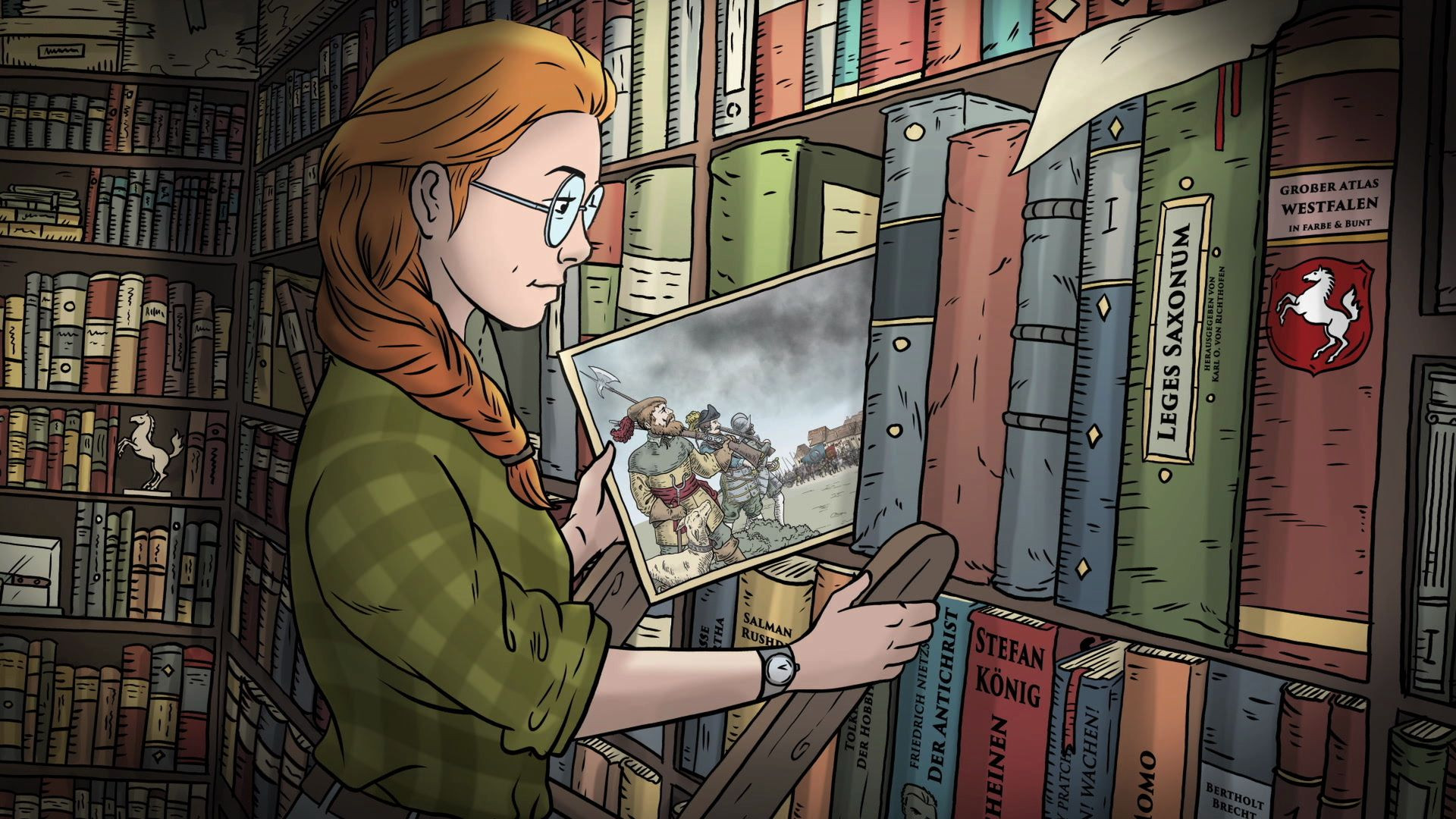 „Mit dem Animationsfilm möchten wir einen leichten Zugang zur Geschichte Westfalens bieten. Im Jubiläumsjahr kann er zudem einen Impuls geben, sich in Ausstellungen und Kulturveranstaltungen mit der eigenen Region auseinanderzusetzen“, erklärt Felix Dürich, Referent am LWL-Medienzentrum. Als Erzählerin führt eine junge Antiquarin durch den Film, die von der Schauspielerin Milena Straube gesprochen wird. Mit neugierigen Fragen und dem Griff ins Bücherregal reist die Antiquarin zu prägenden Momenten der Geschichte, die im Animationsfilm zum Leben erwachen.