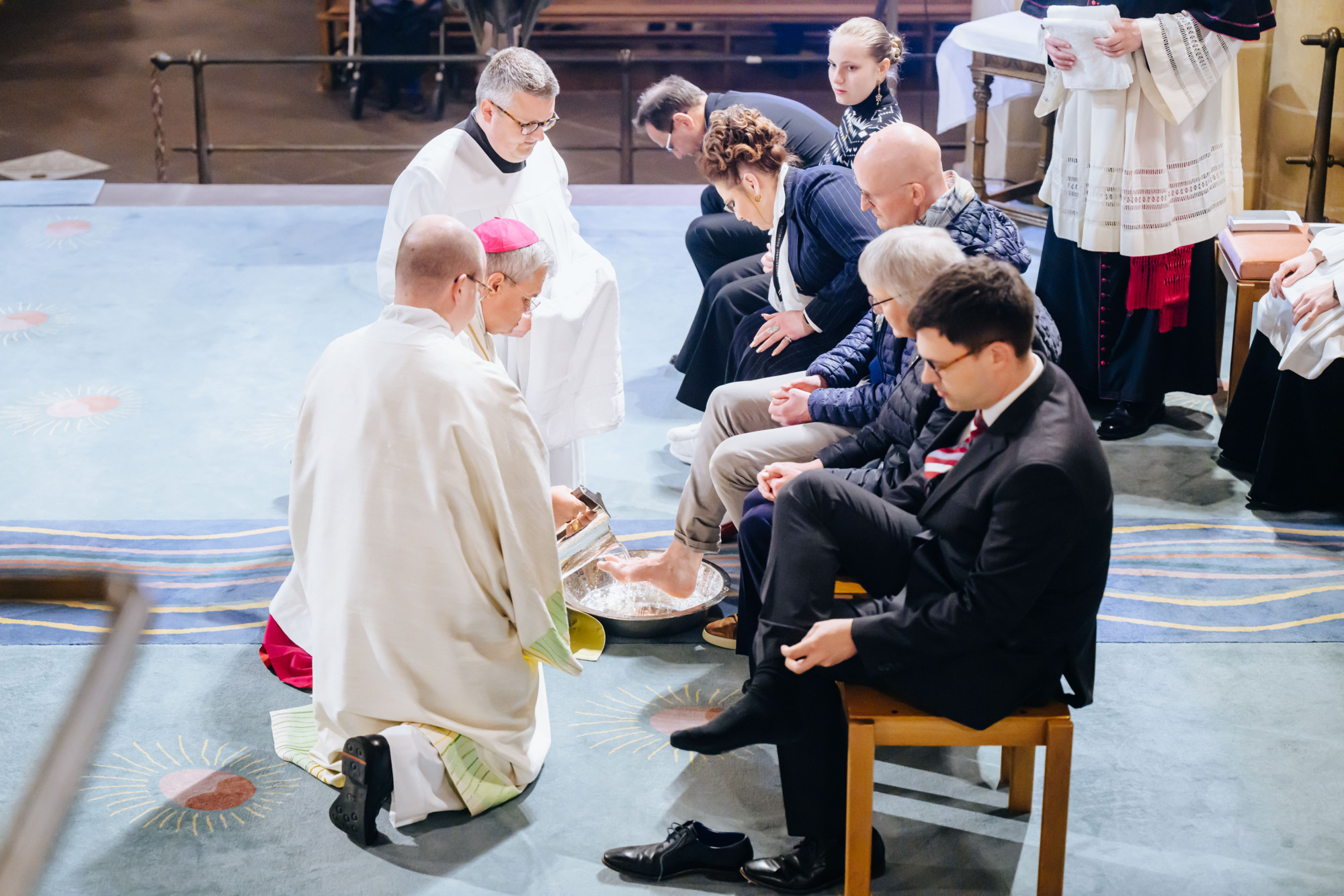So wie Jesus sich seinen Jüngern an jenem Abend trotz ihres Versagens hingegeben habe, gebe er sich auch uns hin: „Dennoch will Jesus mit seinen Jüngern und uns eine Gemeinschaft der Liebe bilden“, führte der Erzbischof aus. Mit der Geste der Fußwaschung, die diese Liebe und Hingabe spürbar werden lässt, wurde auch in diesem Abendmahlsamt an die Liebe Jesu erinnert: So kniete Erzbischof Dr. Bentz nach seiner Predigt nieder und wusch sechs Frauen und sechs Männern die Füße – ein Zeugnis dafür, dass, so wie es Jesus um Demut, Nächstenliebe und gelebte Hingabe geht, der Dienst am Menschen auch in der Kirche im Vordergrund steht.