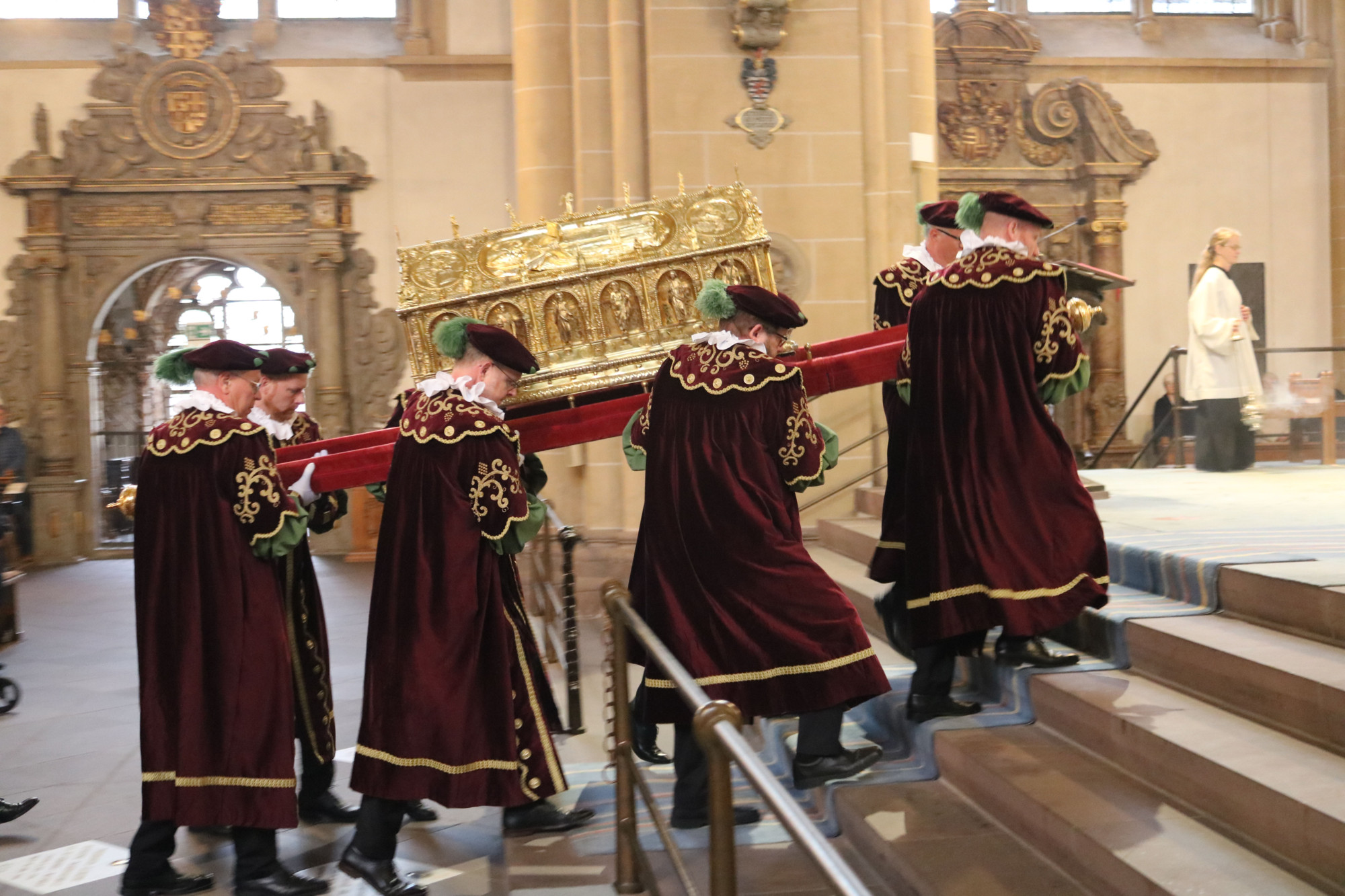 „Herbstlibori“, im Paderborner Volksmund auch „Klein-Libori“ genannt, kann in seiner Strahlkraft zwar nicht ganz mit dem sommerlichen Libori-Fest mithalten – gleichwohl gab es jetzt im Hohen Dom Parallelen: Während des Gottesdienstes, an dem neben dem Bürgermeister Michael Dreier zahlreiche prominente Gäste aus der Stadtgesellschaft teilnahmen, wurden die Reliquien des heiligen Liborius erhoben. Dabei trugen die Libori-Schreinträger den vergoldeten Silberschrein aus dem 17. Jahrhundert samt der eingesetzten Ebenholztruhe mit den Überresten des Heiligen Liborius aus der Krypta in den Hochchor des Domes. Nach dem Absetzen des Schreins spendeten die Gläubigen anhaltenden Applaus und zeigten damit die Bedeutung dieses Symbols für die Menschen in Paderborn.