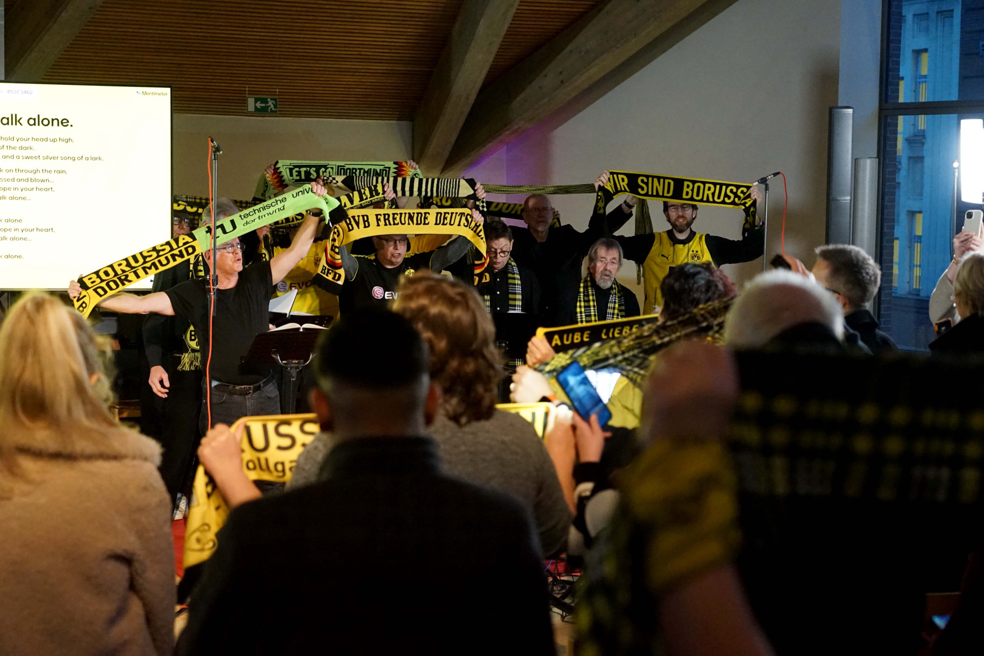 Traditionell gehören Fangesänge zur Feier. In diesem Jahr wurden sie von den Phoenix Harmonists gestaltet, deren schwarz-gelbes Repertoire die liturgischen Elemente musikalisch begleitete und für eine besondere Atmosphäre sorgte. Im Anschluss nutzten viele Teilnehmende die Gelegenheit zum persönlichen Austausch mit Erzbischof Dr. Bentz.
