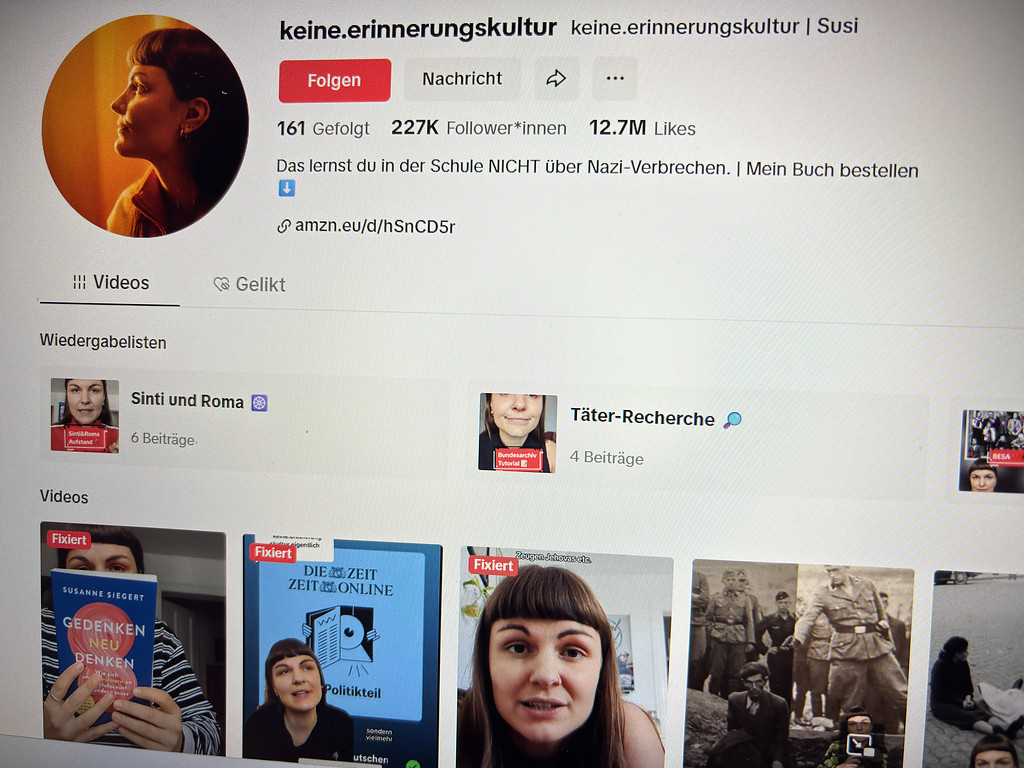 Die lokale Nähe zu früheren Tatorten sieht die Influencerin als Möglichkeit, diese Geschichten greifbar zu machen, ebenso einen Blick in den eigenen Stammbaum – und eine andere Sprache. In ihren Videos spricht sie selten von „den Nazis“ und erläutert an einem Beispiel, warum: Die Bücherverbrennung, die sie dort kürzlich thematisierte, „das waren deutsche Studentenschaften, Studis. Das klar zu benennen, verändert die Perspektive“.