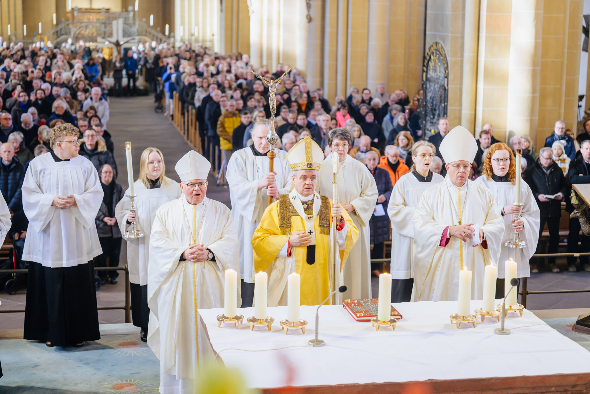 Weihbischof Matthias König und Weihbischof em. Hubert Berenbrinker konzelebrierten im festlichen Gottesdienst. Sängerinnen und Sänger von Domchor und Domkantorei, Blechbläser der Nordwestdeutschen Philharmonie, Domorganist Tobias Aehlig an der Orgel unter der Gesamtleitung von Domkapellmeister Thomas Berning gestalteten den Gottesdienst musikalisch. Schwester Judith Beule übersetzte Texte und Lieder des Gottesdienstes in Gebärdensprache.