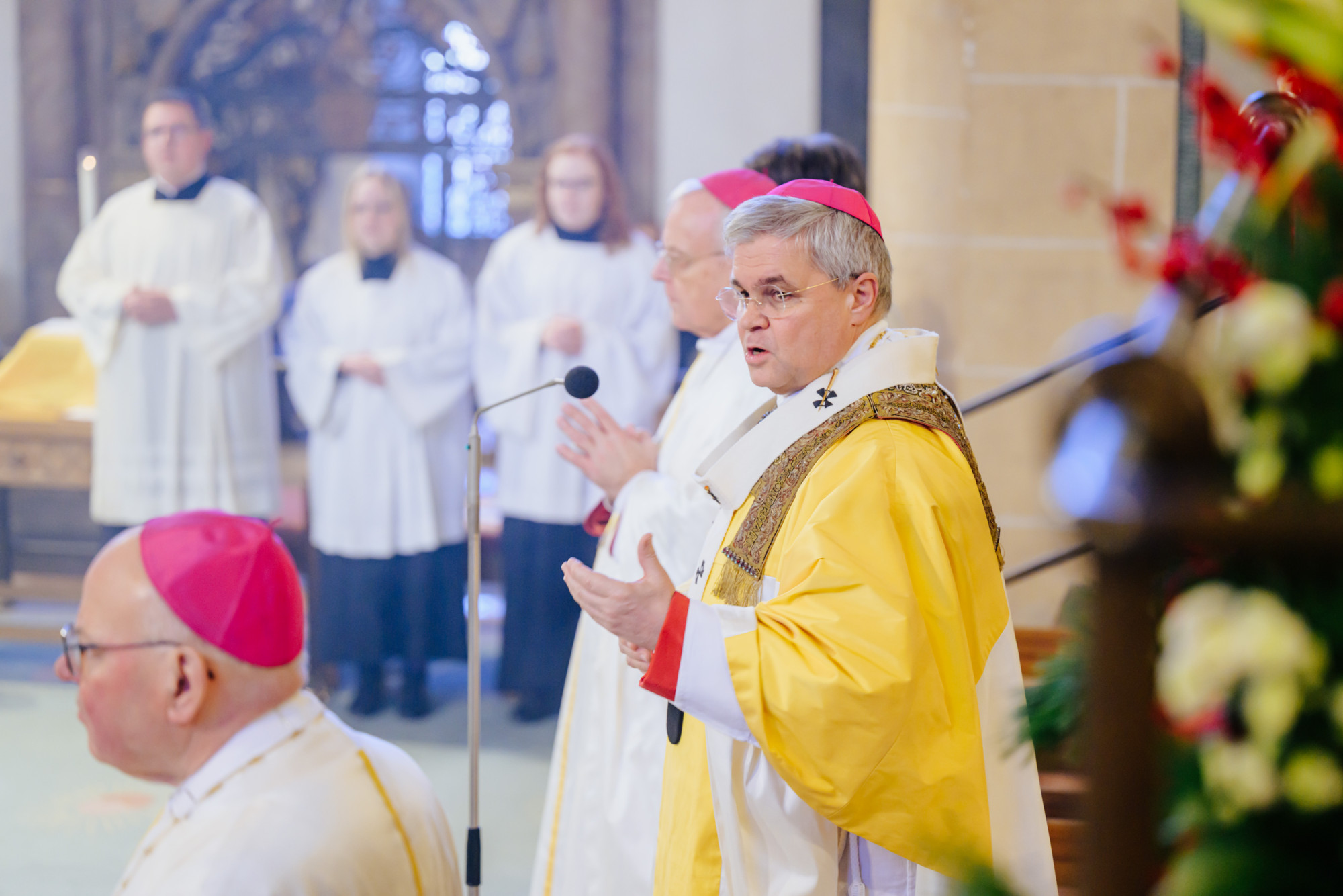 „Kein Platz für Gott in dieser Welt?“, fragte Erzbischof Dr. Udo Markus Bentz am Beginn seiner Predigt im Pontifikalamt und zeigte sich besorgt: Gott werde am Verhandlungstisch kein Platz eingeräumt in den Gewissen der Mächtigen, die Verantwortung tragen über Krieg und Frieden, Leid und Zukunft geschundener Menschen. Gott erhalte keinen Platz zwischen „dem Getöse und Gerangel aufgeblähter Egos“, die leadership beanspruchen, denen es aber um sich selbst gehe.