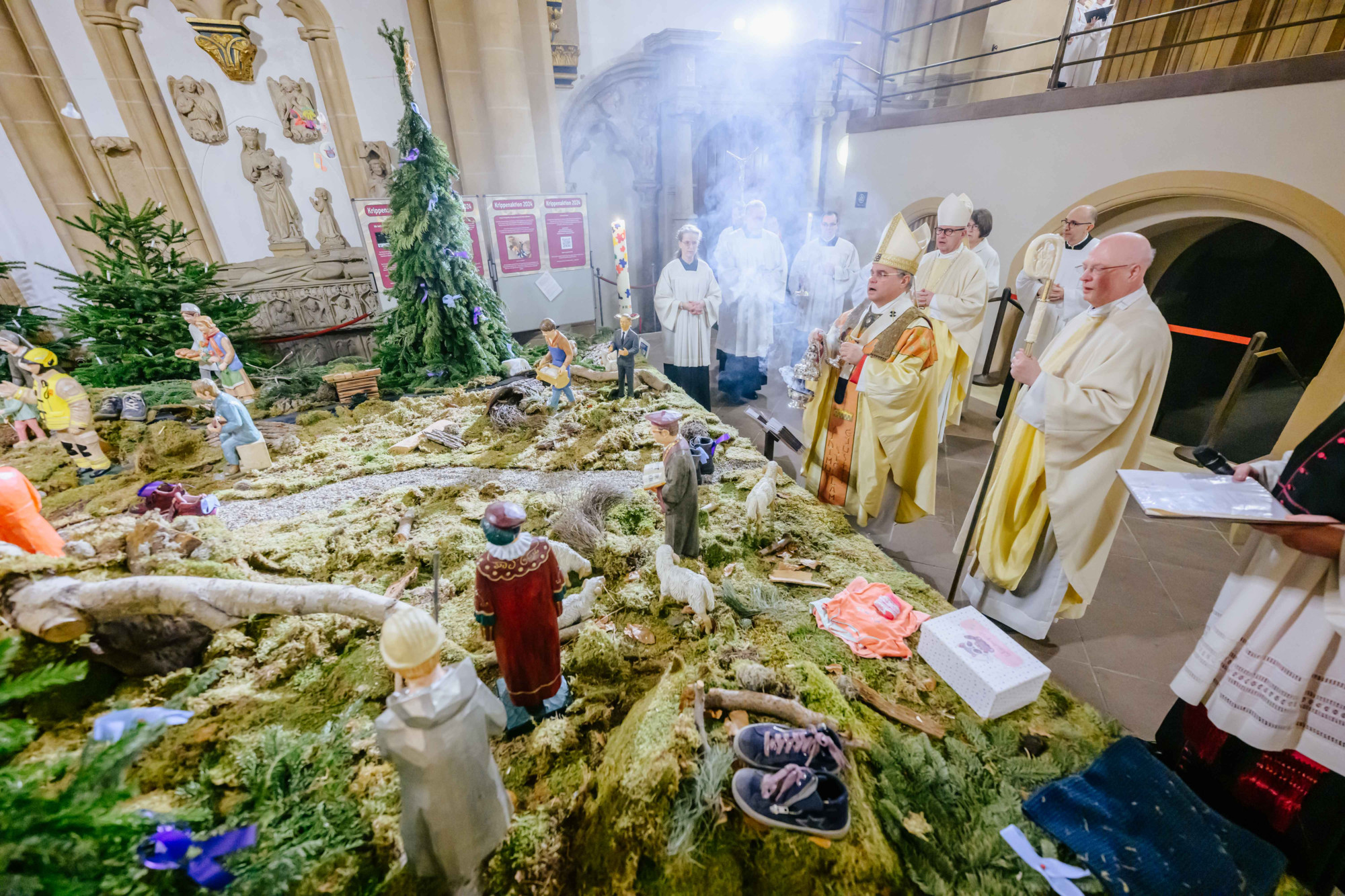 Gottes Menschlichkeit im Kind in der Krippe werde zum Maß unserer Menschlichkeit, führte Erzbischof Dr. Udo Markus Bentz weiter aus. „An Gottes Menschlichkeit, die wir in Jesus Christus erkennen, nehmen wir Christen für unser Menschsein Maß.“ Es komme darauf an – sich nicht davor zu fürchten –, zu glauben und zu vertrauen, „dass nicht Macht und Gewalt den Menschen retten, sondern uns eine Menschlichkeit rettet, die uns in Jesus Christus vorgegeben ist“. Das „wir“ sei wesentlich, die Mitmenschlichkeit des Menschen rette, das Mitmenschliche gebe den Menschen Zukunft. „Dieses Maß der Menschlichkeit Jesu ist der innere Kompass für verantwortungsvolles Handeln. Dieses Maß der Menschlichkeit Jesu ist der Weg zur Versöhnung – der einzige Weg zum Frieden, wie er uns auf den Feldern von Bethlehem zugesprochen wird“, betonte Erzbischof Dr. Bentz zum Abschluss seiner Predigt.