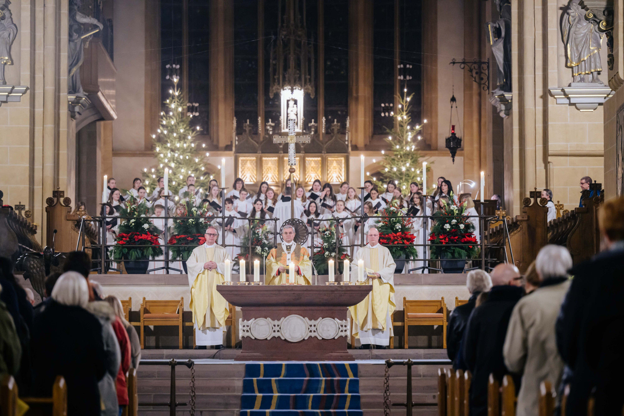 In der Christmette zogen nach dem Evangelium die Konzelebranten und liturgischen Dienste gemeinsam mit Erzbischof Dr. Udo Markus Bentz zur Krippe im Hohen Dom zu Paderborn. Diese inzensierte der Paderborner Erzbischof mit Weihrauch. Weihbischof Josef Holtkotte und Domdechant Apostolischer Protonotar Alfons Hardt konzelebrierten im festlichen Gottesdienst. Sängerinnen der Mädchenkantorei am Paderborner Dom unter der Leitung von Domkantor Patrick Cellnik und Domorganist Tobias Aehlig an der Orgel gestalteten den Gottesdienst musikalisch.