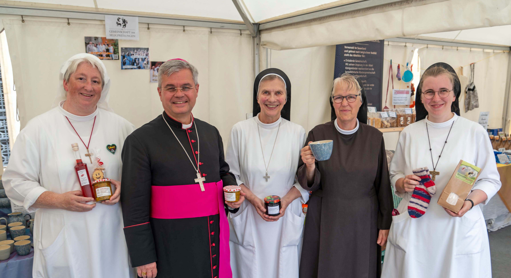 Erstmals beim Libori-Fest richteten Ordensgemeinschaften aus dem Erzbistum Paderborn im „Zelt vor dem Dom“ einen Klosterladen ein. Das Metropolitankapitel hatte sie dazu eingeladen und so bieten jetzt Ordens-Christen – Benediktinerinnen der Abtei in Herstelle, Benediktiner der Abtei in Meschede, Schwestern der Heiligen Maria Magdalena Postel im Bergkloster Bestwig, Schwestern der Christlichen Liebe in Paderborn, Franziskanerinnen Salzkotten, Missionsschwestern vom Kostbaren Blut in Neuenbeken sowie die Gemeinschaft der Seligpreisungen aus Paderborn – an Libori ihre Produkte an. Libori-Besucher können dort Töpferartikel, Marmeladen, Liköre, Backwaren, Backmischungen, Ikonen, gestrickte Socken, Brotaufstriche, Kerzen, Seifen und vieles mehr erwerben. Das besondere Angebot der Klöster ist dabei: Ordens-Christen stehen für Gespräche und Begegnungen „auf dem Sofa“ bereit. Erzbischof Dr. Udo Markus Bentz besuchte nach dem Pontifikalamt den Klosterladen und freute ich mit den Schwestern über die gute Resonanz.