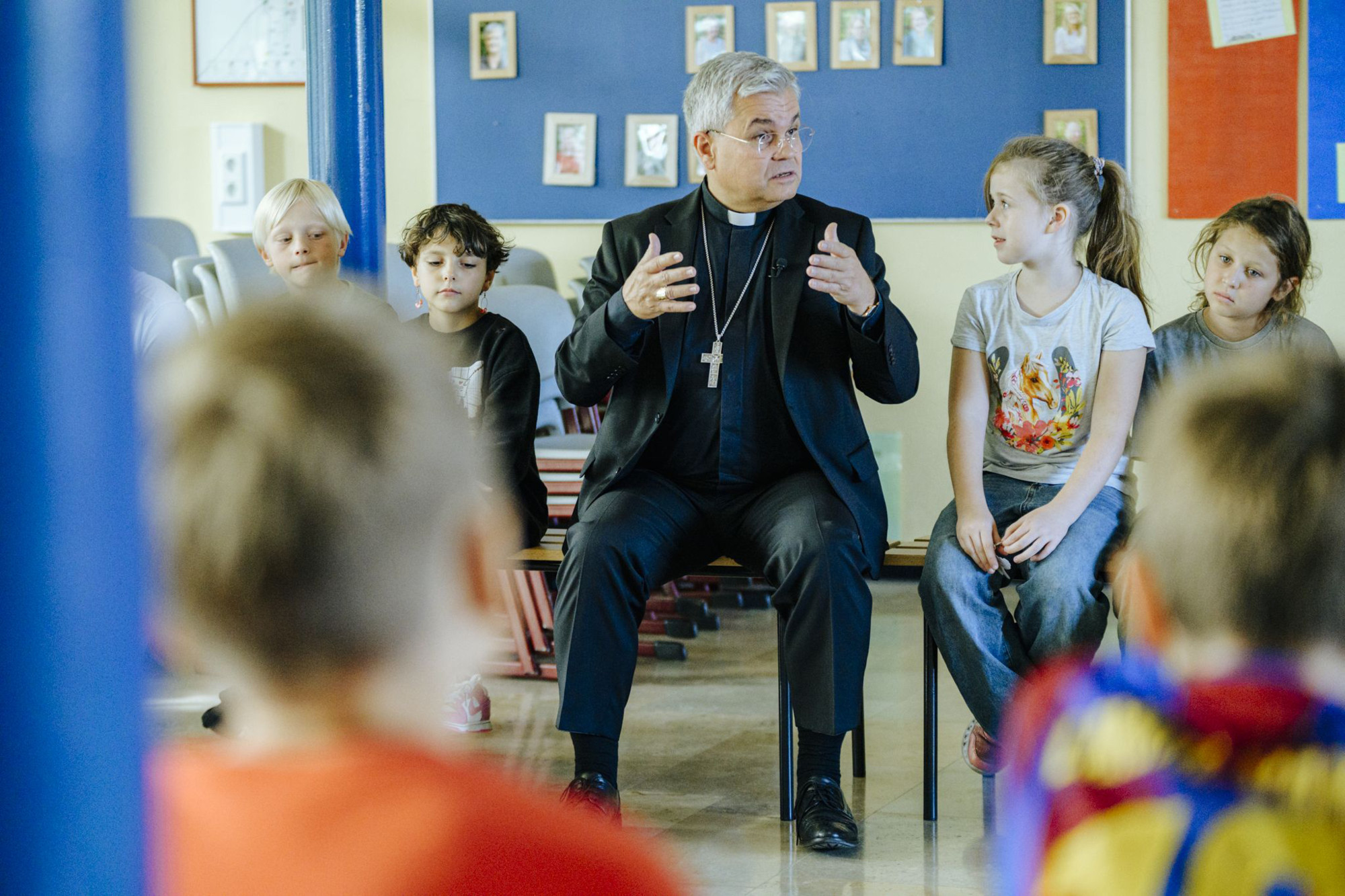 Weitere bunte Einblicke konnte der Erzbischof bei der Vorstellungsrunde gewinnen: Wer geht in welche Klasse? Wer kommt mit dem Bus, zu Fuß oder mit dem Fahrrad zur Schule? Wer hat sich auf den Schulstart gefreut? Die Frage „Was oder wer hat euch beim Schulstart geholfen?“ ging dann ganz in die Richtung der Schulstartaktion.