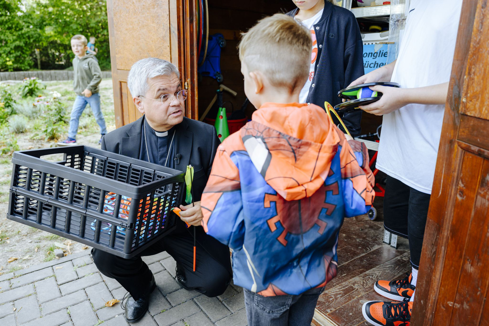 Auch die Pause verlief auf Augenhöhe: Erzbischof Dr. Udo Markus Bentz teilte zunächst mit den Mädchen und Jungen das Frühstück, probierte unter anderem Tomaten aus dem eigenen Schulgarten. Auf dem Schulhof kam er mit den Kindern weiter ins Gespräch – und spielte Frisbee. Dazu passend übergab er auch noch ein „großes“ Gastgeschenk für die ganze Schule: Zum Austoben auf dem Schulhof konnten sich die Kinder von Bällen bis Reifen über eine bunte Mischung an Spielzeug für die Pause freuen.