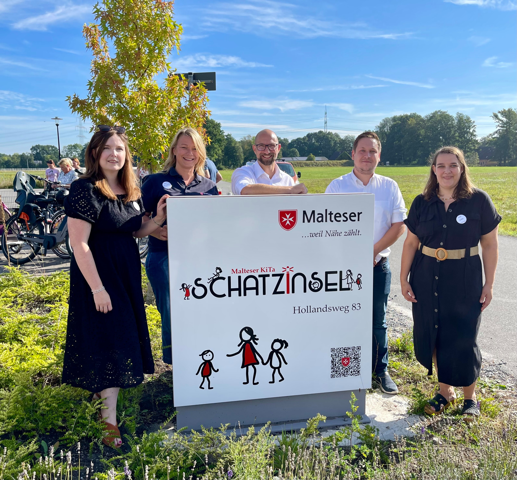 Info: Die KiTa Schatzinsel unter der Trägerschaft des Malteser Hilfsdienst e. V. hat aktuell 21 pädagogisch Mitarbeitende, zwei Küchenkräfte und einen Hausmeister. In sechs modern ausgestatteten Gruppenräumen werden 107 Kinder im Alter von unter eins bis sechs Jahre betreut, begleitet und gefördert. Der Kita-Bau am Hollandsweg 83 bietet 1.100 Quadratmeter Nutzfläche. Im Außenbereich mit mehreren Spielzonen stehen weitere 4.000 Quadratmeter zur Verfügung.