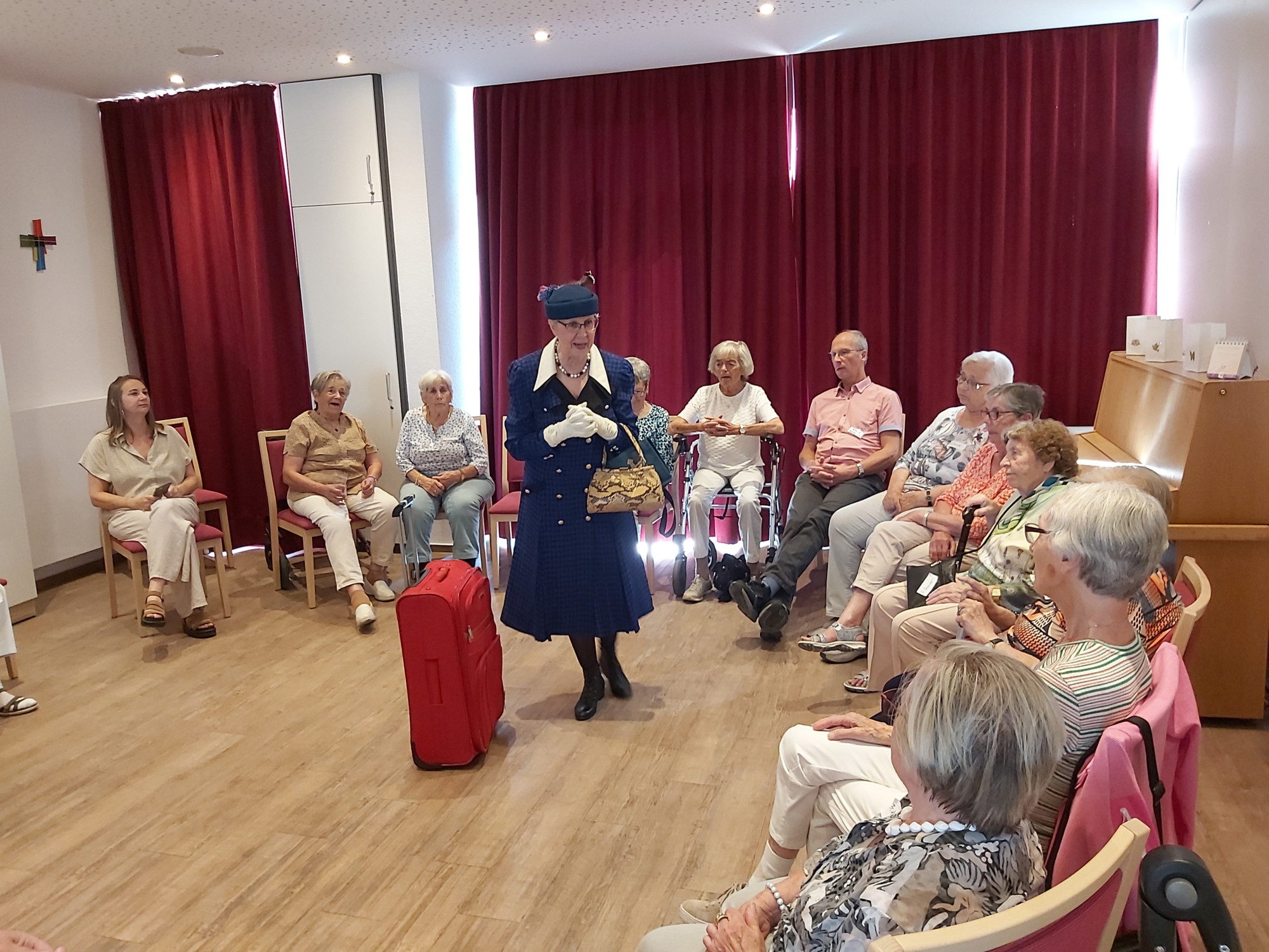 Angekündigt als Überraschung, aber dennoch staunten die 16 Urlauber nicht schlecht: Die Cousine von Queen Elisabeth gab sich die Ehre. Darstellerin Birgit Lange verlieh dem Pfarrheim Glanz und Gloria und konnte aus dem Nähkästchen plaudern. Dieser Auftritt war Teil des abwechslungsreichen Programms von Urlaub ohne Koffer, zu dem Claudia Wetter (Caritas) herzlich im Namen des ehrenamtlichen Teams begrüßte. Ende August fanden diese bunten Tage rund um St. Bonifatius statt. Bevor der Adel anreiste, konnte bereits Hermann Ross seine Zuhörer begeistern. Der Imker erzählte anschaulich von seinen Tätigkeiten und bot frischen Honig an. Weitere Highlights folgten in den weiteren Tagen, die den Urlaubern viel Freude bereiteten.
