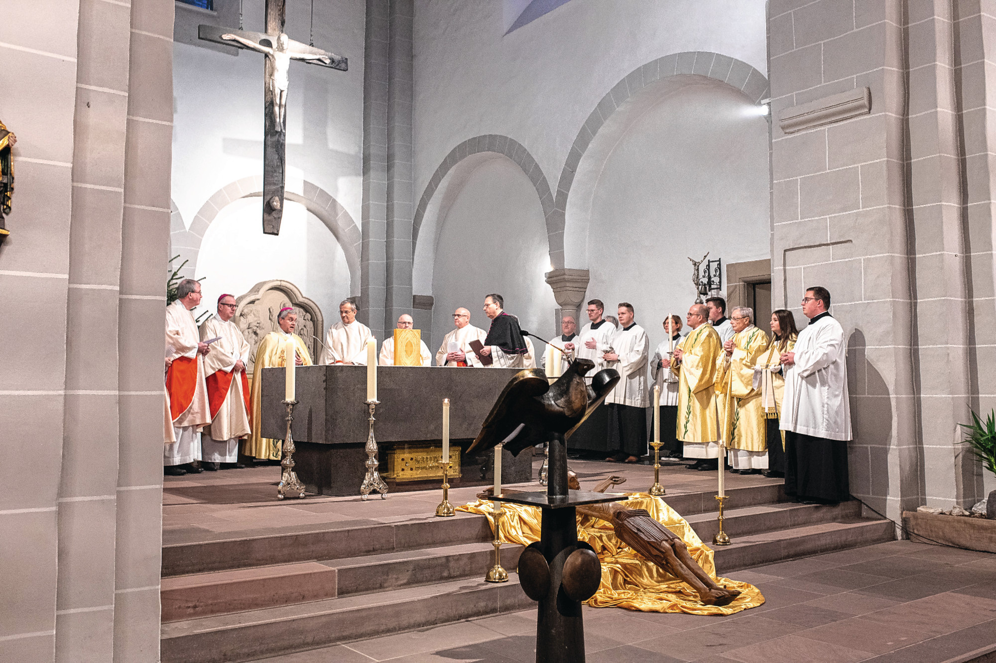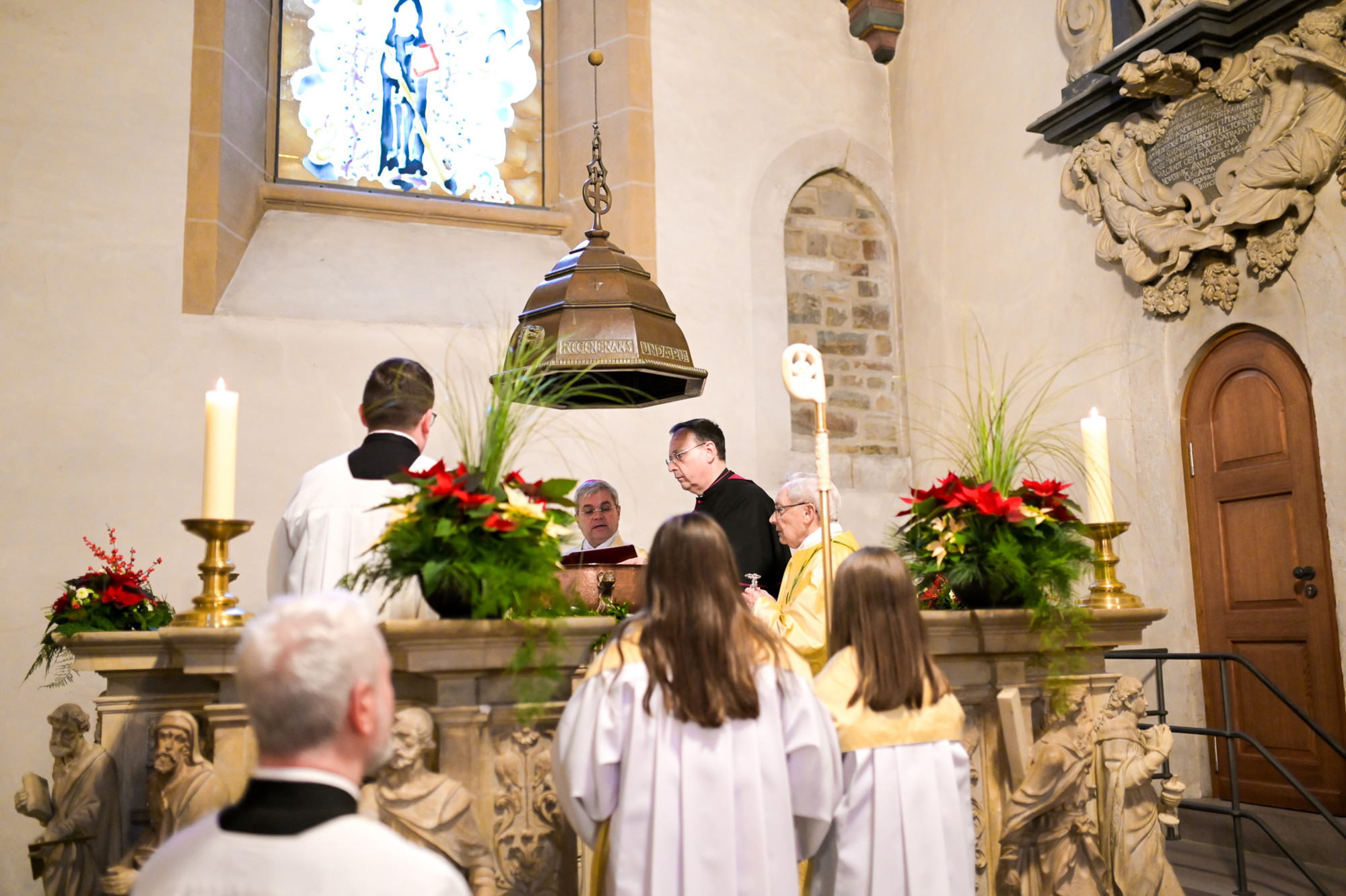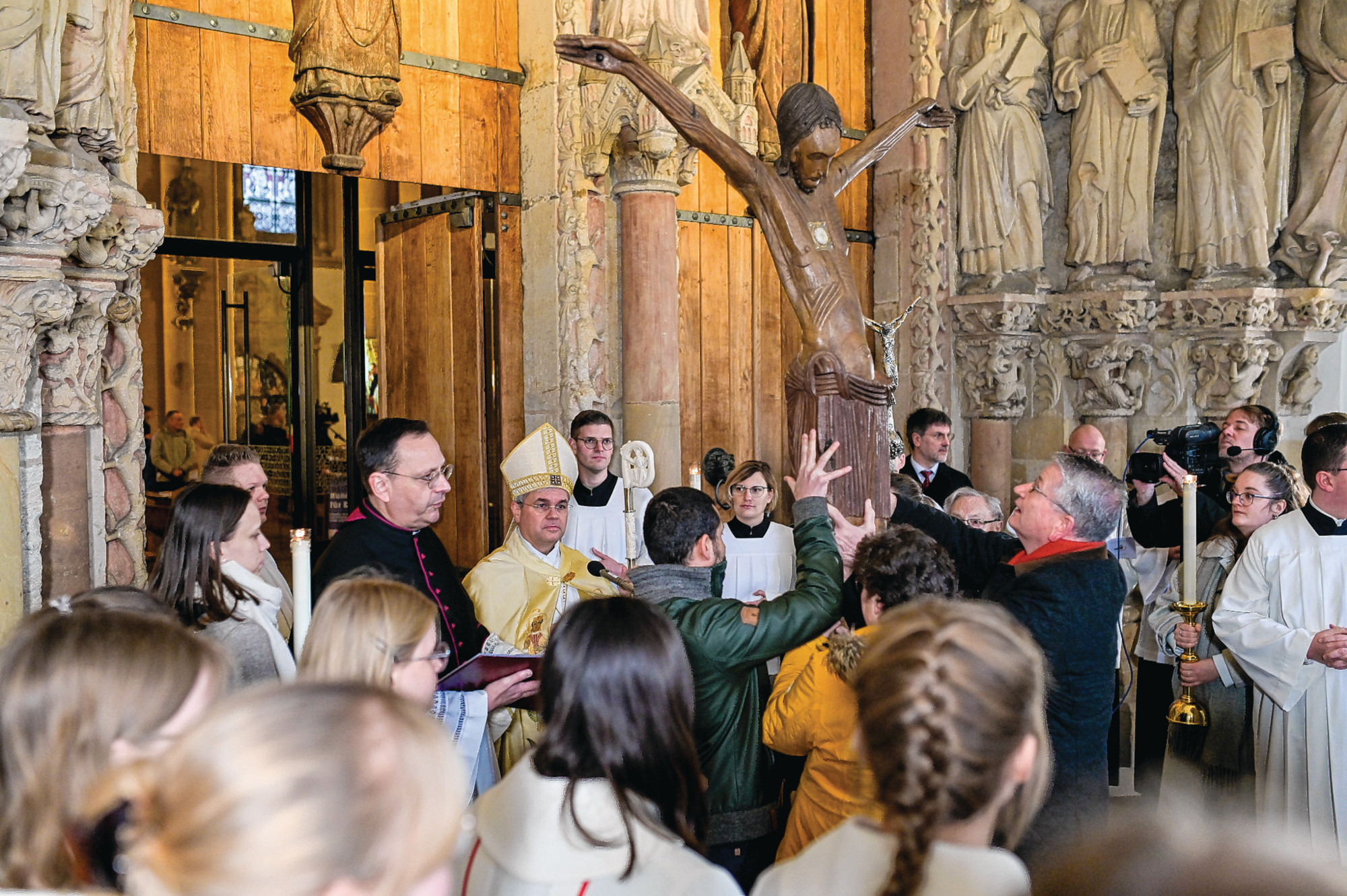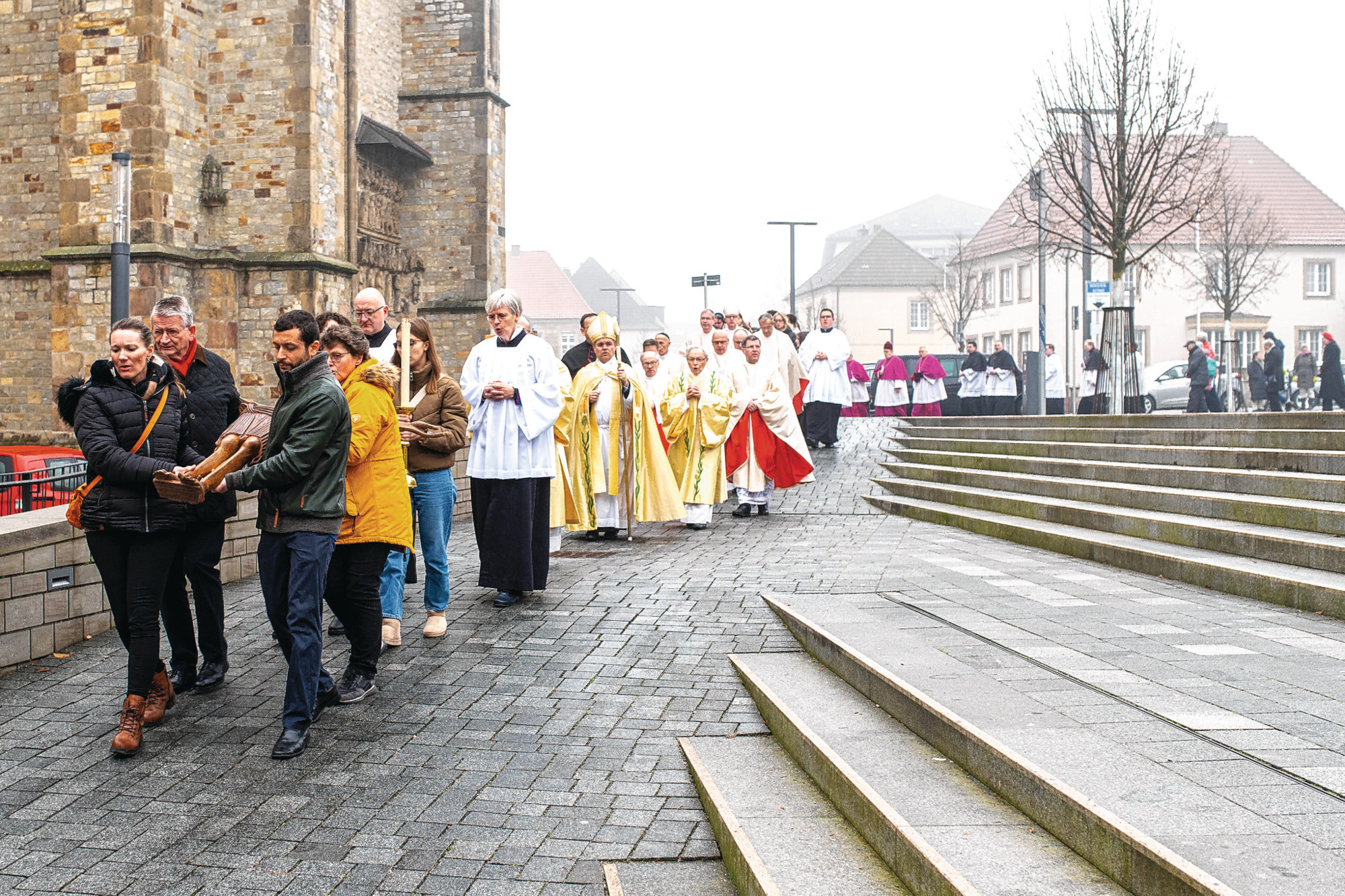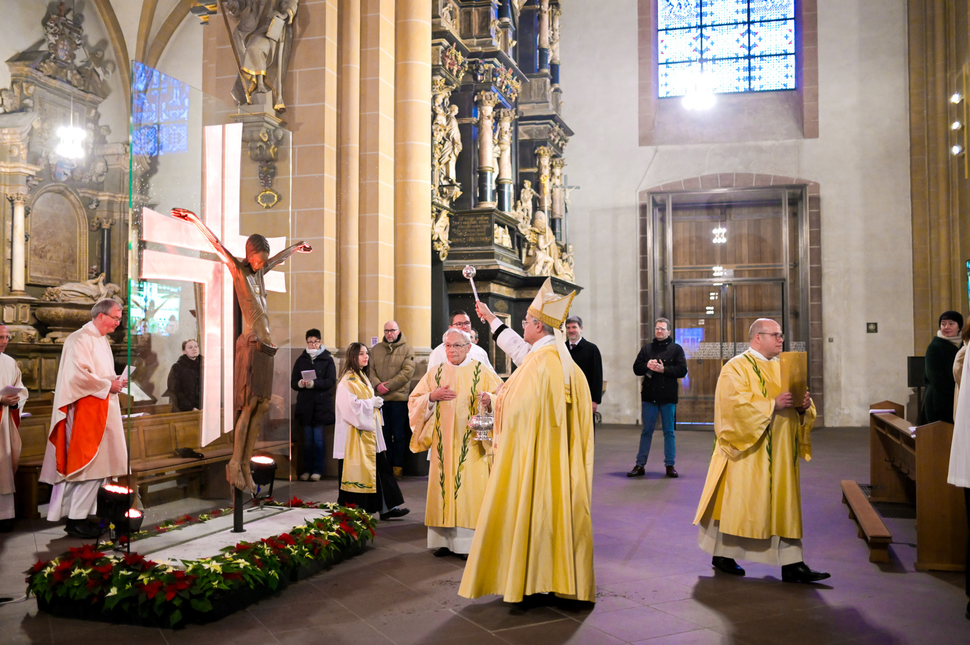 Den zweiten Teil des Gottesdienstes feiern die Gläubigen im Hohen Dom zu Paderborn. Hierfür macht sich die Prozession aus Klerus und Gläubigen unter dem Gesang der „Christus-Rufe“ gemeinsam auf den Weg. Das Jubiläumskreuz, eine Replik des Benninghauser Kruzifixus aus dem Paderborner Diözesanmuseum, das zuvor schon in der Gaukirche zu sehen war, wird nun zum Hohen Dom getragen. Am Paradiesportal des Doms angelangt, lädt Erzbischof Dr. Udo Markus Bentz zunächst zur Kreuzverehrung ein, bevor die Prozession schließlich in den Dom einzieht. Hier wird das Jubiläumskreuz an der Stele des Heiligen Jahres angebracht. Nachdem Erzbischof Dr. Udo Markus Bentz die Stele samt Jubiläumskreuz gesegnet hat, schreitet er weiter, um das Weihwasser im Taufbrunnen zu segnen. Anschließend zieht er gemeinsam mit den Messdienerinnen und Messdienern sowie den Konzelebranten durch den Mittelgang zum Altarraum.
