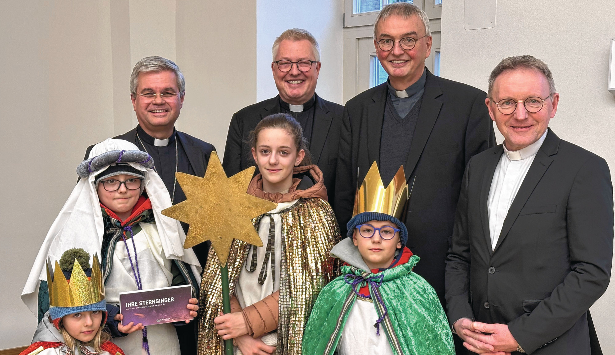 Der Neujahrsempfang erhielt traditionell auch königlichen Glanz: Ende 2024 haben rund 1.500 Königinnen und Könige die Aktion Dreikönigssingen bundesweit in Paderborn eröffnet. Jetzt brachten Sternsingerinnen und Sternsinger aus der Paderborner Innenstadtpfarrei St. Liborius den Segen „Christus mansionem benedicat“ ins Liborianum. Die Gäste des Neujahrsempfangs unterstützten die Aktion, bei der die Mädchen und Jungen in diesem Jahr unter dem Motto „Erhebt euere Stimme! Sternsingen für Kinderrechte“ auf die Straße gegangen sind.