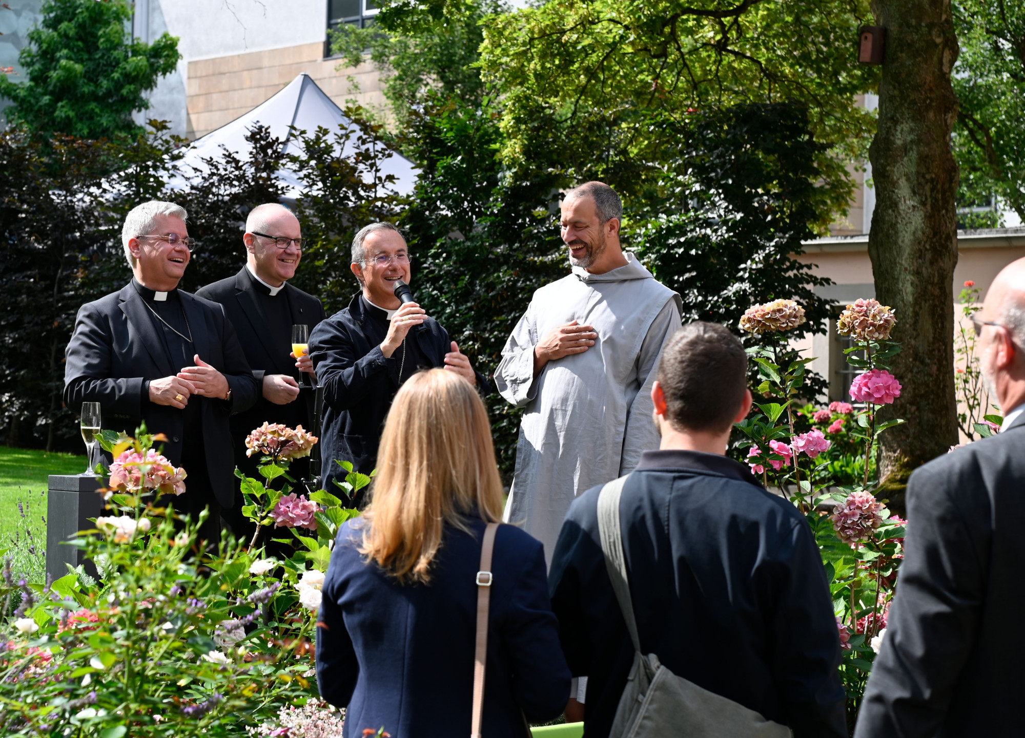 Nach dem Pontifikalamt trafen sich die französischen Gäste auf Einladung von Erzbischof Dr. Udo Markus Bentz im Bischofsgarten. Domkapitular Dr. Thomas Witt, Vorsitzender der deutsch-französischen Liborius-Fraternität, bedankte sich bei Erzbischof Dr. Bentz, „für das große Interesse, das Sie in diese Freundschaft gebracht haben“. Sowohl dem Paderborner Erzbischof als auch Bischof Dr. Jean-Pierre Vuillemin dankte Dr. Witt dafür, die Freundschaft zwischen Le Mans und Paderborn neu belebt zu haben. Der Bischof von Le Mans machte darauf aufmerksam, dass sowohl er als auch der Paderborner Erzbischof Bienenbesitzer seien. „Im Jahr 2027, zum 400-jährigen Jubiläum der Rückkehr der geraubten Libori-Reliquien, können wir dann den Honig der beiden Bistümer vermischen“, schlug der Bischof von Le Mans für die Zukunft vor.