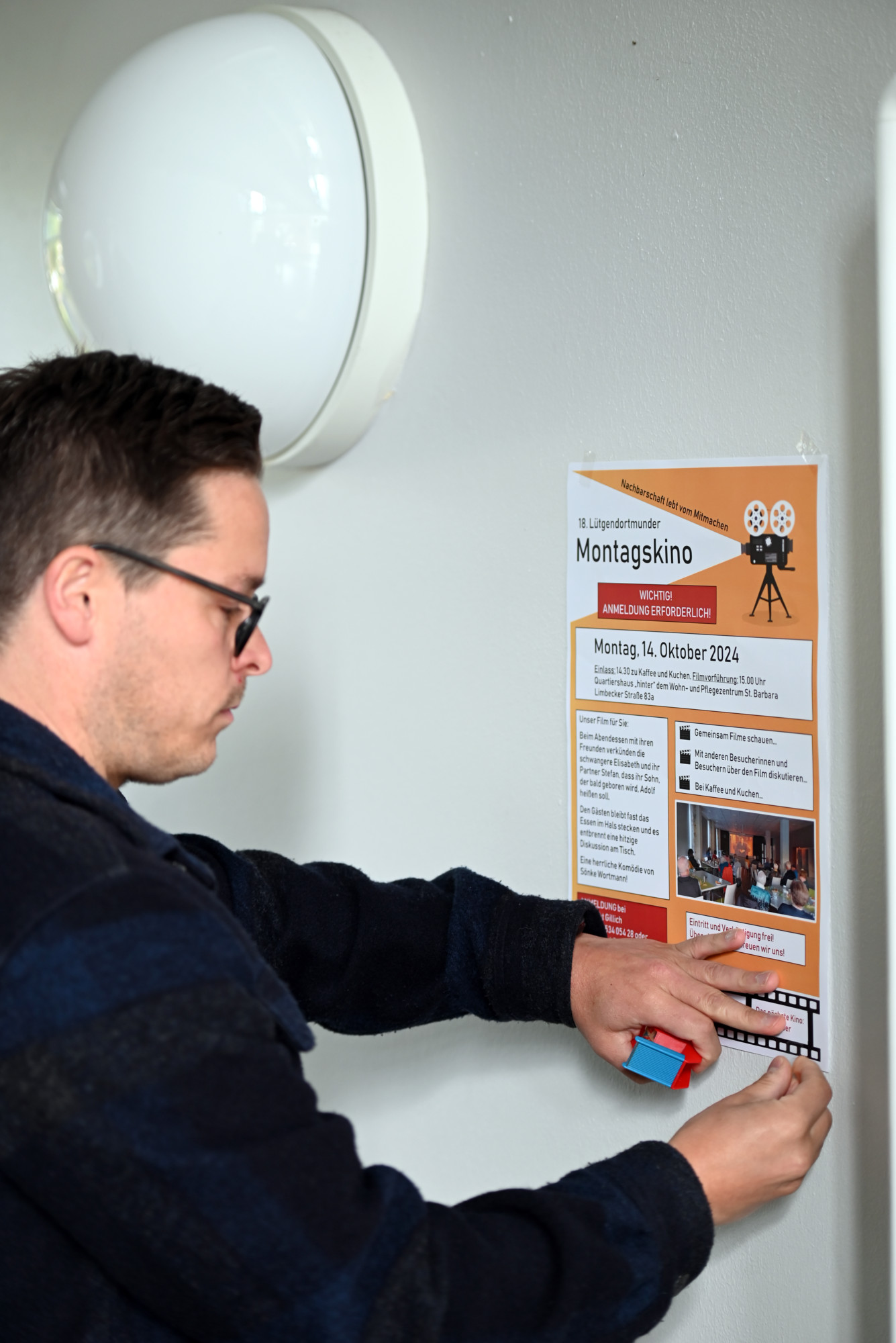 Die monatliche Filmvorführung, die mithilfe von ehrenamtlich Engagierten organisiert wird, biete mehr als Unterhaltung. „Es ist ein niederschwelliges Angebot. Man muss nicht mitmachen, kann einfach still einen Film sehen.“ Gerade Personen, die nach langer Ehe den Partner oder die Partnerin verloren haben, nutzen dies. Hauptsache wieder unter Menschen kommen und nicht vereinsamen – ein zentrales Ziel der Quartiersarbeit. Tatsächlich erreicht das Team viele Interessierte ganz klassisch über Meldungen in der Tageszeitung oder Aushänge im Wohn- und Pflegeheim, aber auch im Supermarkt oder Zeitschriftenladen. Ganz offline funktioniert das – aber es funktioniert. Benedikt Gillich zieht deshalb regelmäßig los, um die Plakate zu verteilen. Positiver Nebeneffekt: Er und somit der Quartierstreff sind im Stadtteil zu sehen. Auch die Kirchengemeinden vor Ort seien wichtige Partner, „sie machen hier sehr viel“. Dennoch gebe es auch „die Unerreichbaren“. Das sind Nachbarinnen und Nachbarn, die trotz aller Angebote und der Aussicht auf Gemeinschaft lieber in ihren Wohnungen bleiben. Dann drohe Vereinsamung. Und es gebe ebenso Menschen, die eben lieber alleine sind, weiß Gillich. Das müsse man respektieren. Auch wenn das Quartiersmanagement diese unerreichbaren Personen gerne mitnehmen möchte – hier stößt es an seine Grenzen.