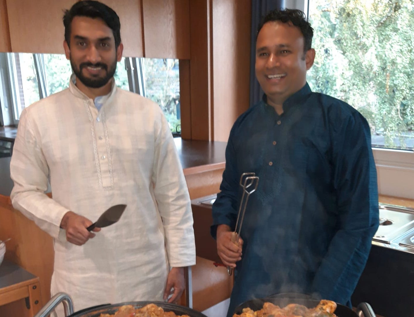 Nun konnte jeder die Begeisterung der beiden Hobbyköche erleben, landestypische Gerichte anbieten zu dürfen. Mit einem Helferteam hätten sie aus Zeitgründen schon mal vorgekocht, damit es ein gemütlicher Abend würde, sagten sie zur Begrüßung, denn: „Es war uns eine Ehre, für sie zu kochen.“ Gekleidet in typisch indische Gewänder stellten die Priester die Zutaten von fünf Gerichte vor und beantworteten Fragen.