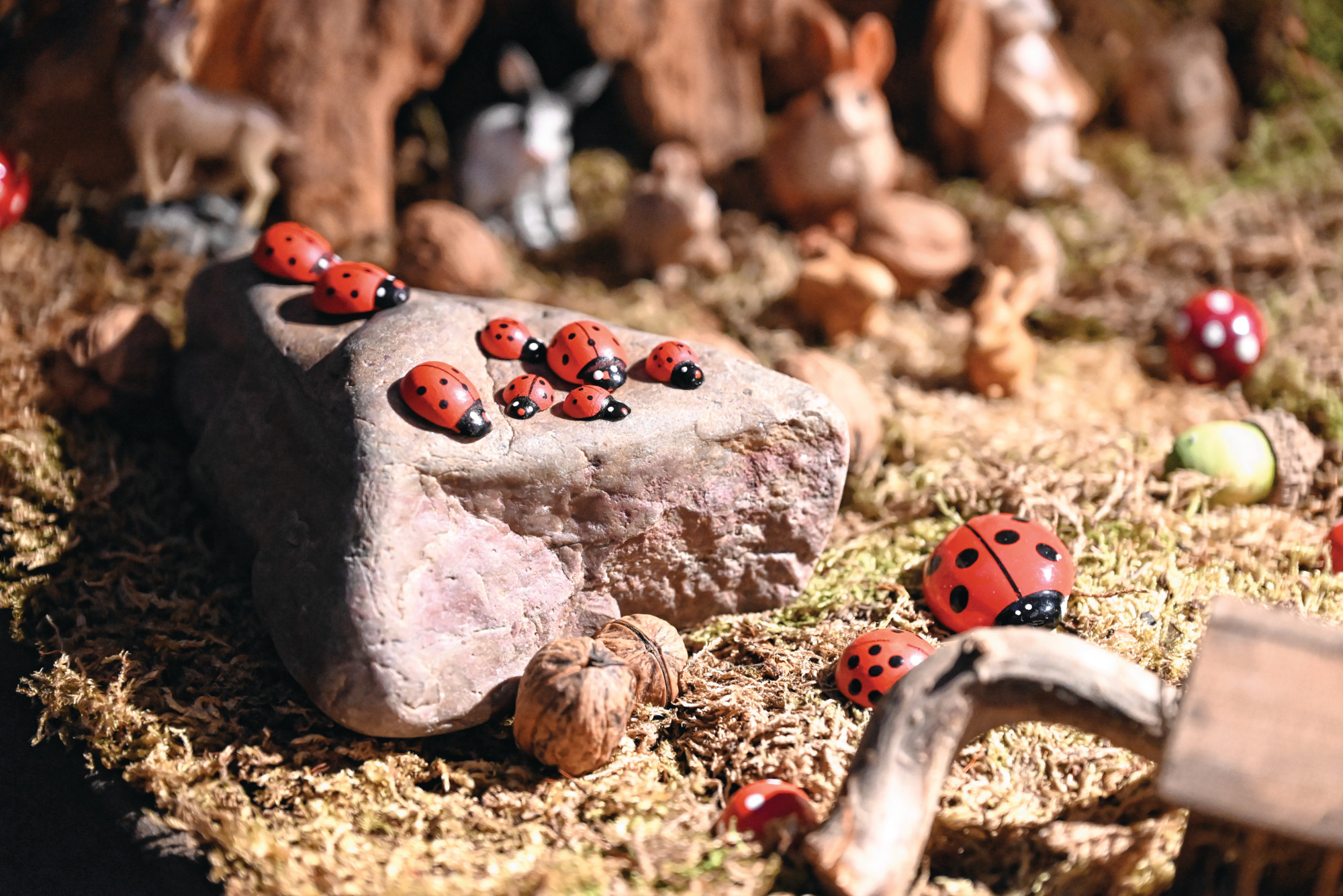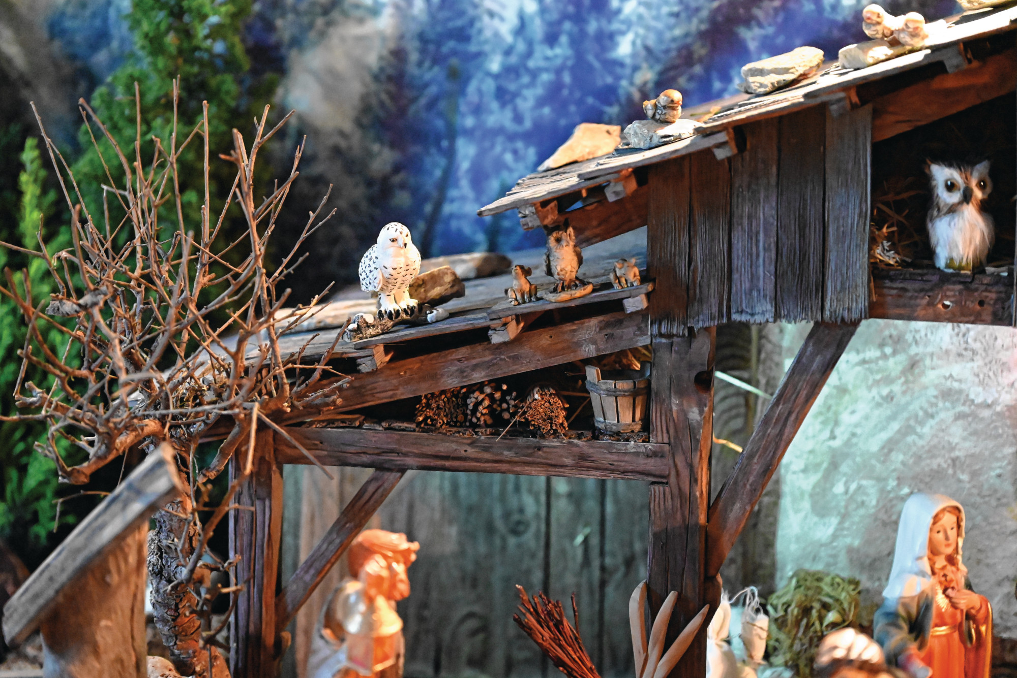 Einen festen Plan, wo welche Figur zu stehen hat, hat der Franziskaner dabei nicht. „Meine Krippe ist jedesmal anders.“ Das Ganze funktioniere nur so. Zentral ist natürlich die Geburt Jesu in ärmlichen Verhältnissen. Diese Szene fällt sofort ins Auge. Doch was sitzt da im Gebälk des Stalls? Eine weiße Eule schaut den Betrachter oder die Betrachterin direkt an. Philipp Heine lächelt. Ja, einen solchen Vogel erwartet man nicht. Doch stört er? Und warum? Für den Franziskaner ist das kein Problem. Die Natur komme zur Krippe, zu Gottes Sohn. Und das bedeute: Es ist Platz für die gesamte Schöpfung. So tummeln sich auf einem Stein auch mehrere Marienkäfer. „Die habe ich geschenkt bekommen und mir gedacht: Warum sollen sie nicht vorkommen?“