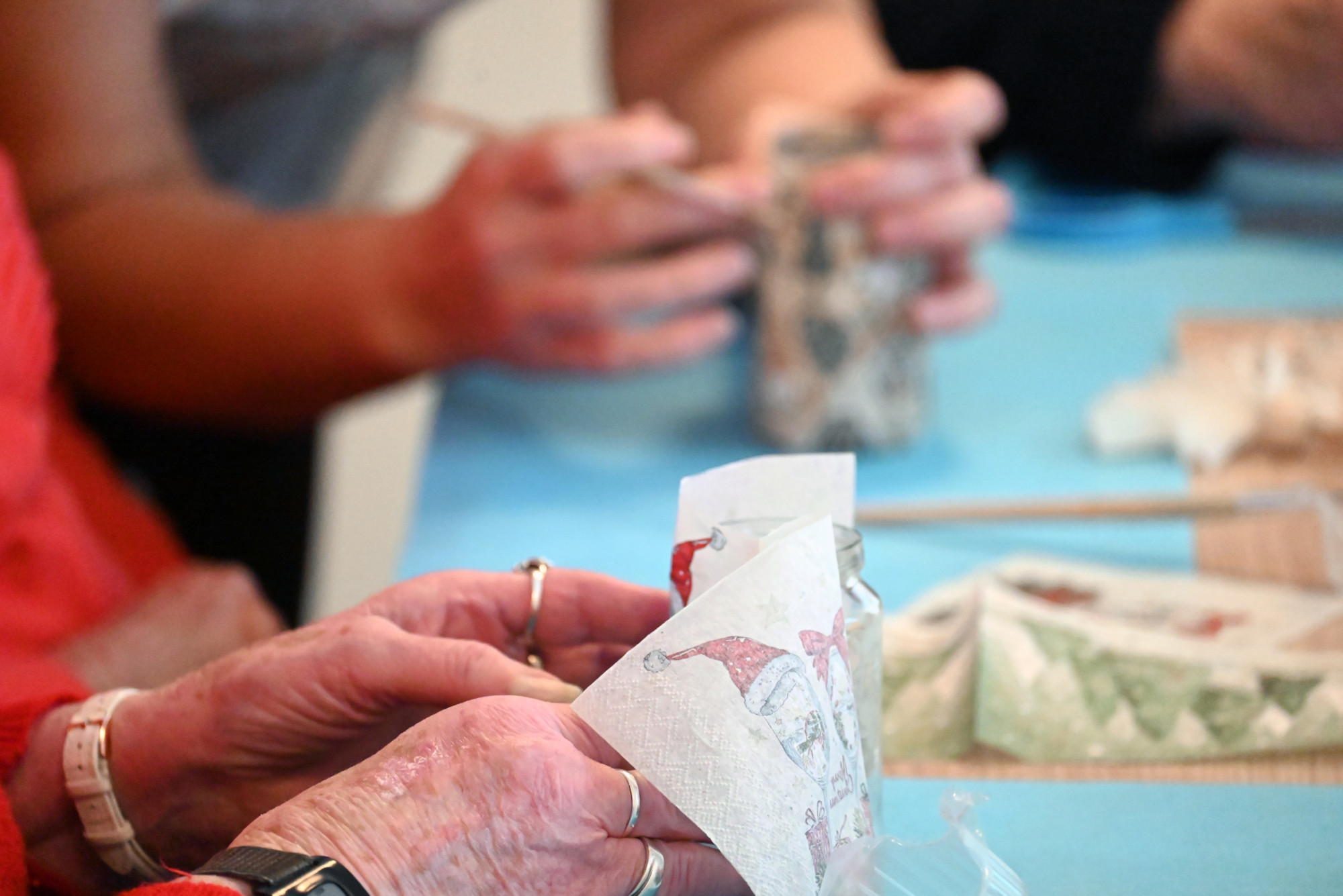 In einem separaten Zimmer wird gerade gebastelt. Die Damen und Herren bekleben Gläser mit weihnachtlichen Motiven. Nebenan wird gesungen, dazu bewegen die Gäste ihre Arme im Takt. Ein Herr sitzt still etwas abseits. Das Singen scheint nicht seine Leidenschaft zu sein, doch das ist in Ordnung. „Jeder so, wie er kann“, sagt Katrin Müller und winkt der Pflegehelferin Simona Blasi zu, die die musikalische Runde leitet. Niemand müsse an einer Aktion teilnehmen. Sich in einen der gemütlichen Sessel setzen und in aller Ruhe Musik hören, auch das ist in der Tagespflege möglich – oder etwas spielen.