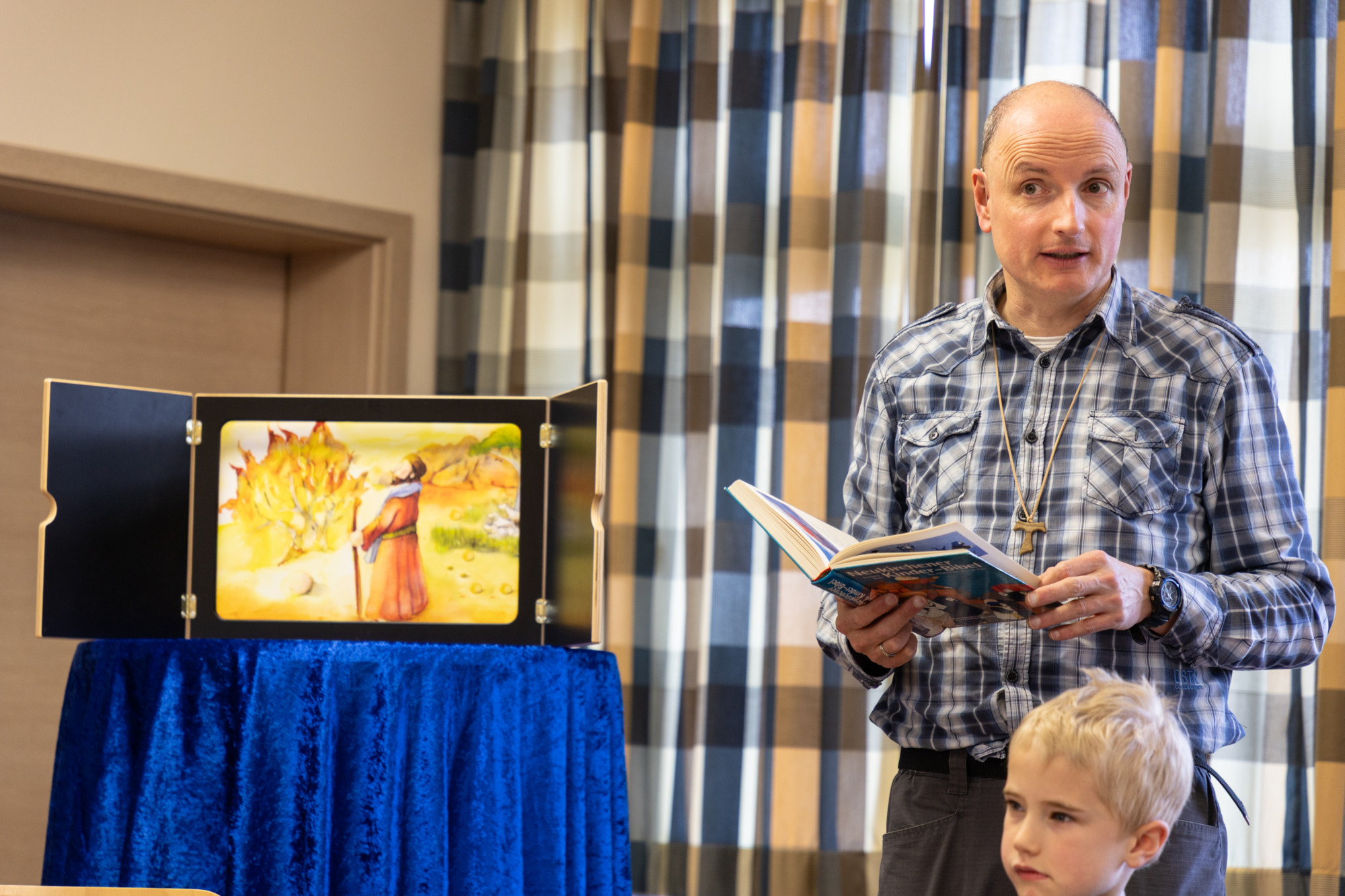 „Und Gott sprach zu Mose: ,Mose, heb’ deine Hand. Und das Meer wird sich teilen, solange du die Hand hebst‘“, liest Christof Stracke. Sein Arm beschreibt eine Bewegung durch die Luft . „Ihr werdet trockenen Fußes auf der anderen Seite ankommen.“ Das Kamishibai hilft Christof Stracke dabei, die Geschichte greifbar zu machen. Bild für Bild zieht er die Bibelkarten aus dem Rahmen, jede Szene ein neuer Impuls. Das Prinzip ist einfach – und gerade deshalb so wirkungsvoll: sehen, hören, mitdenken.