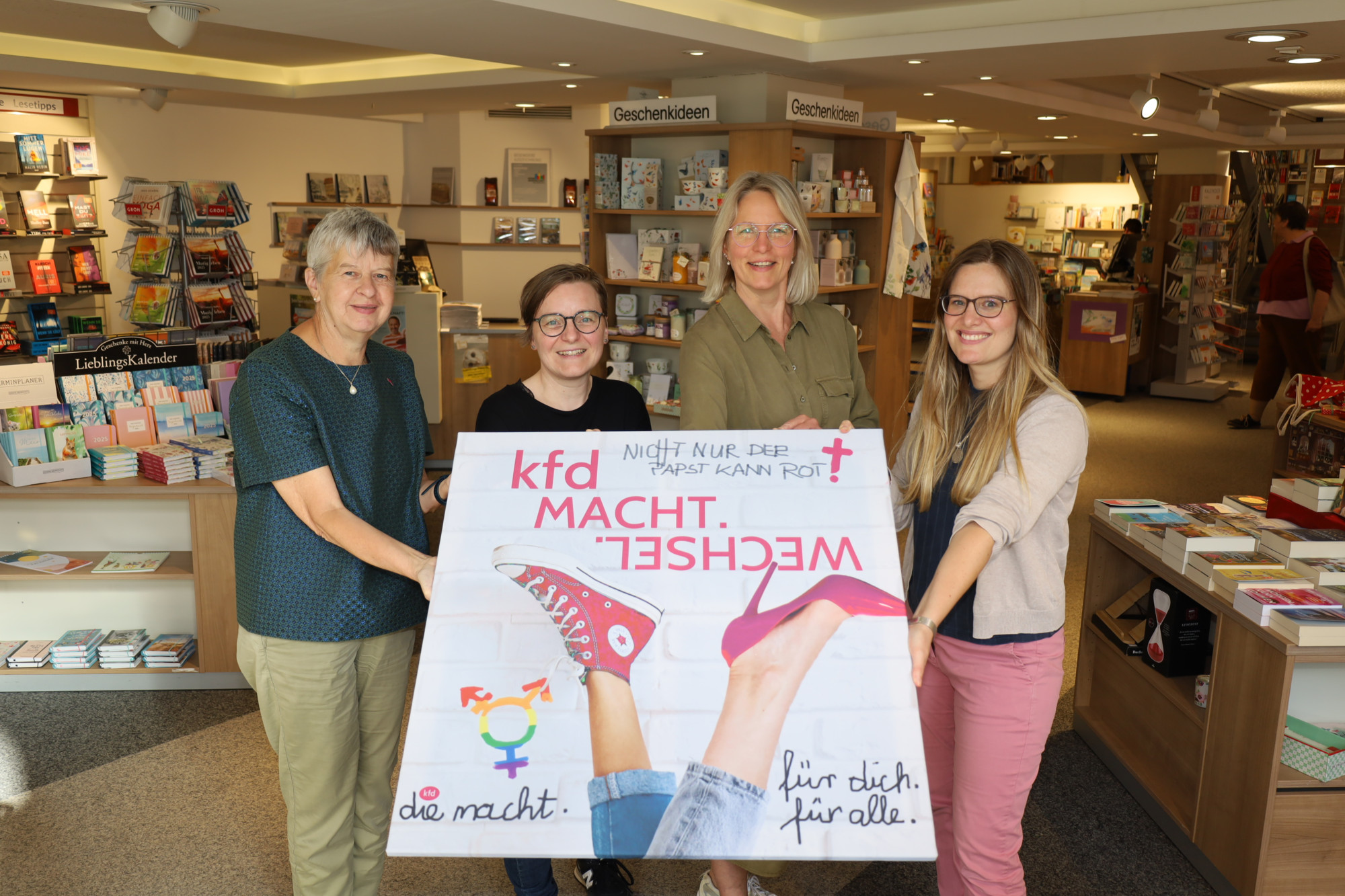 Bis Ende 2024 können die 12 Leinwände in der Bonifatius Buchhandlung Dortmund besichtigt werden. Titel der Leinwände lauten z.B. „kfd MACHT WECHSEL – Nicht nur der Papst trägt roten Schuhe.“, „kfd für ein gutes Klima“, „kfd – katholisch für dich“ oder „anders – nicht artig katholisch“.