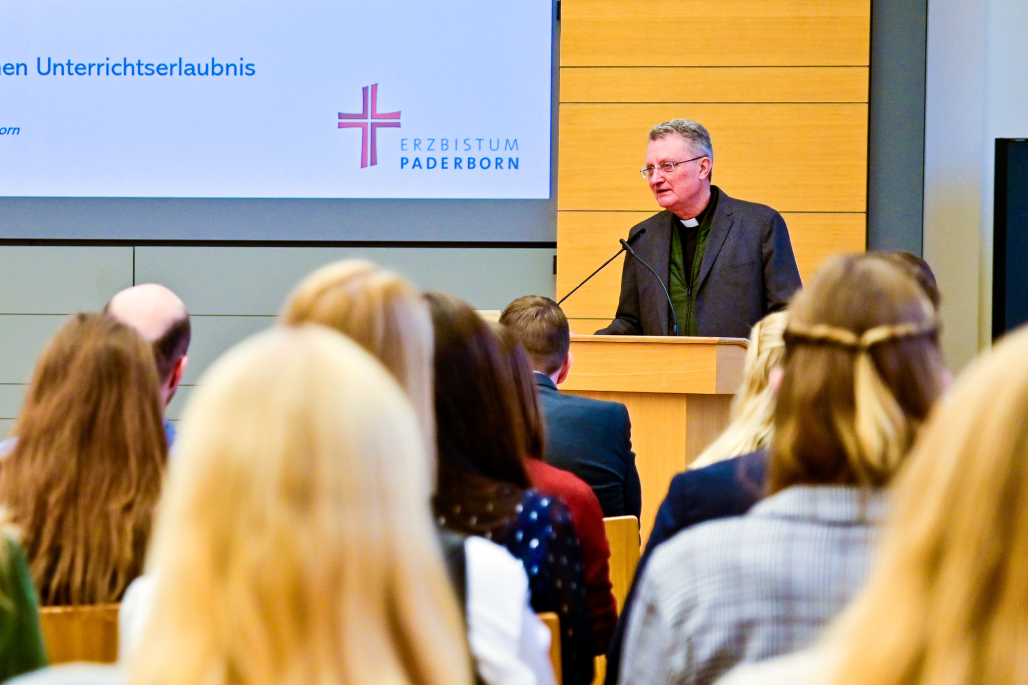 Die Erteilung der Missio Canonica geht traditionell mit einem Tag der Begegnung einher. Die 45 Lehrkräfte, die aus vielen unterschiedlichen Regionen des Paderborner Erzbistums angereist waren und in den Schulformen Primarstufe, Sekundarstufe I und II sowie an der Berufsschule unterrichten, fanden sich bereits am Vormittag im Liborianum ein. Als Leiter des Bereichs Schule und Hochschule im Erzbischöflichen Generalvikariat begrüßte Dompropst Monsignore Joachim Göbel die Lehrerinnen und Lehrer, die auf unterschiedlichen Wegen – sei es durch das grundständige Studium oder innerhalb einer ergänzenden Qualifikation im späteren Berufsleben – für den katholischen Religionsunterricht ausgebildet worden sind. Die Aus- und Weiterbildung von Religionslehrkräften liegt wie auch die Unterrichtserlaubnis nicht nur in staatlicher, sondern auch in kirchlicher Zuständigkeit.