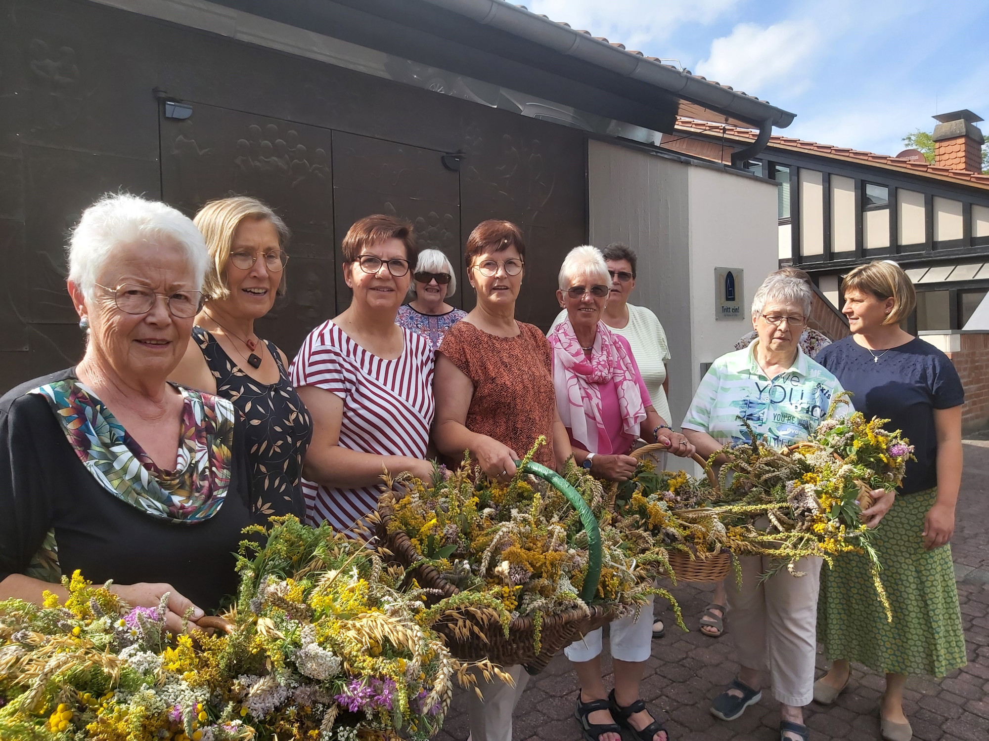 Bereits in den Nachmittagsstunden zeigten mehrere kfd-Frauen, dass auch sie keine halben Sachen angehen. Denn beim Betreten des Bonifatiushauses waren viele bestens ausgestattet mit Kisten und Körben voller Heilpflanzen. Aus Schafgarbe, Hafer, Königskerze & Co. wurden bunte Sträuße gebunden, denen heilende Wirkung nachgesagt wird. Der alte Brauch beruht auf der Legende, dass aus dem Grab der Mutter Jesu Blumen hervorgegangen sein sollen. Nach getaner floristischer Fleißarbeit – insgesamt kamen an die 100 Sträuße zusammen – stärkten sich die Damen beim gemütlichen Kaffeetrinken.