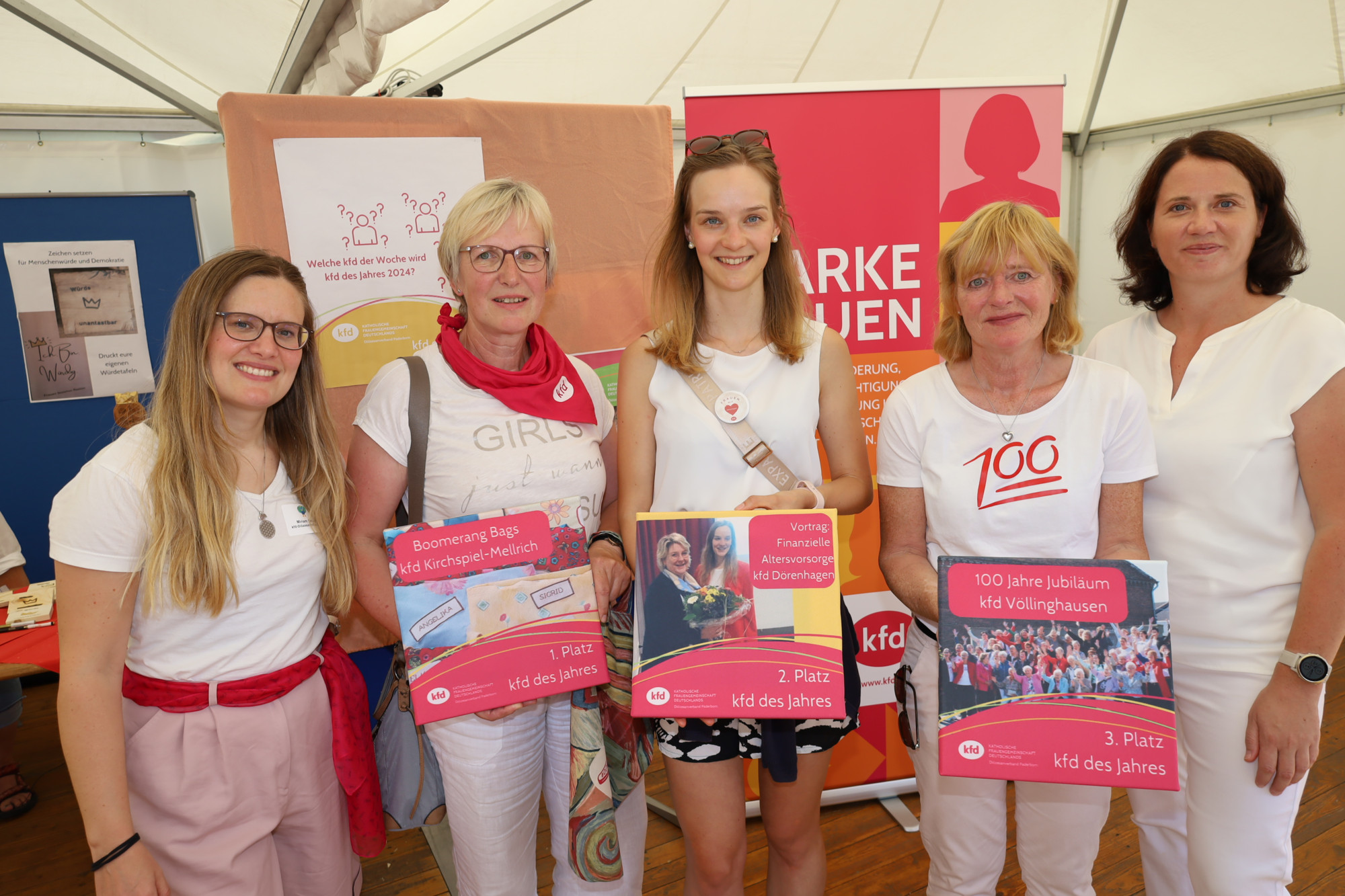 Hunderte Besucherinnen zog es am Libori-Tag der Frauen auf den Kleinen Domplatz. Das Leitungsteam des Diözesanverbands Paderborn der Katholischen Frauengemeinschaft Deutschlands (kfd) hatte zum großen Treffen eingeladen. Der mit Spannung erwartete Höhepunkt des Programms war die Bekanntgabe der Platzierungen aus der Online-Abstimmung „kfd des Jahres“.