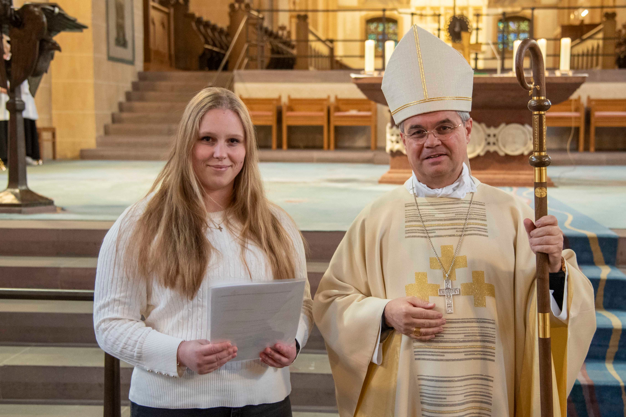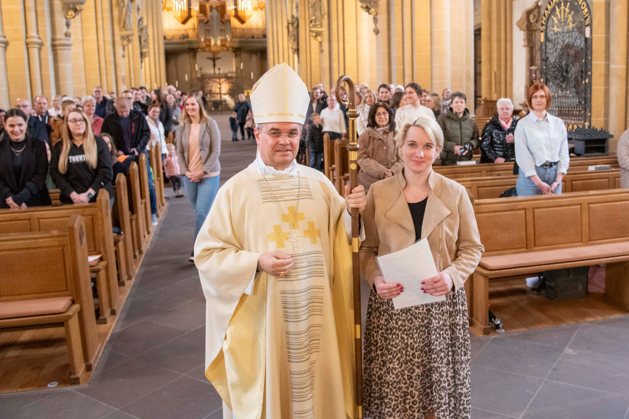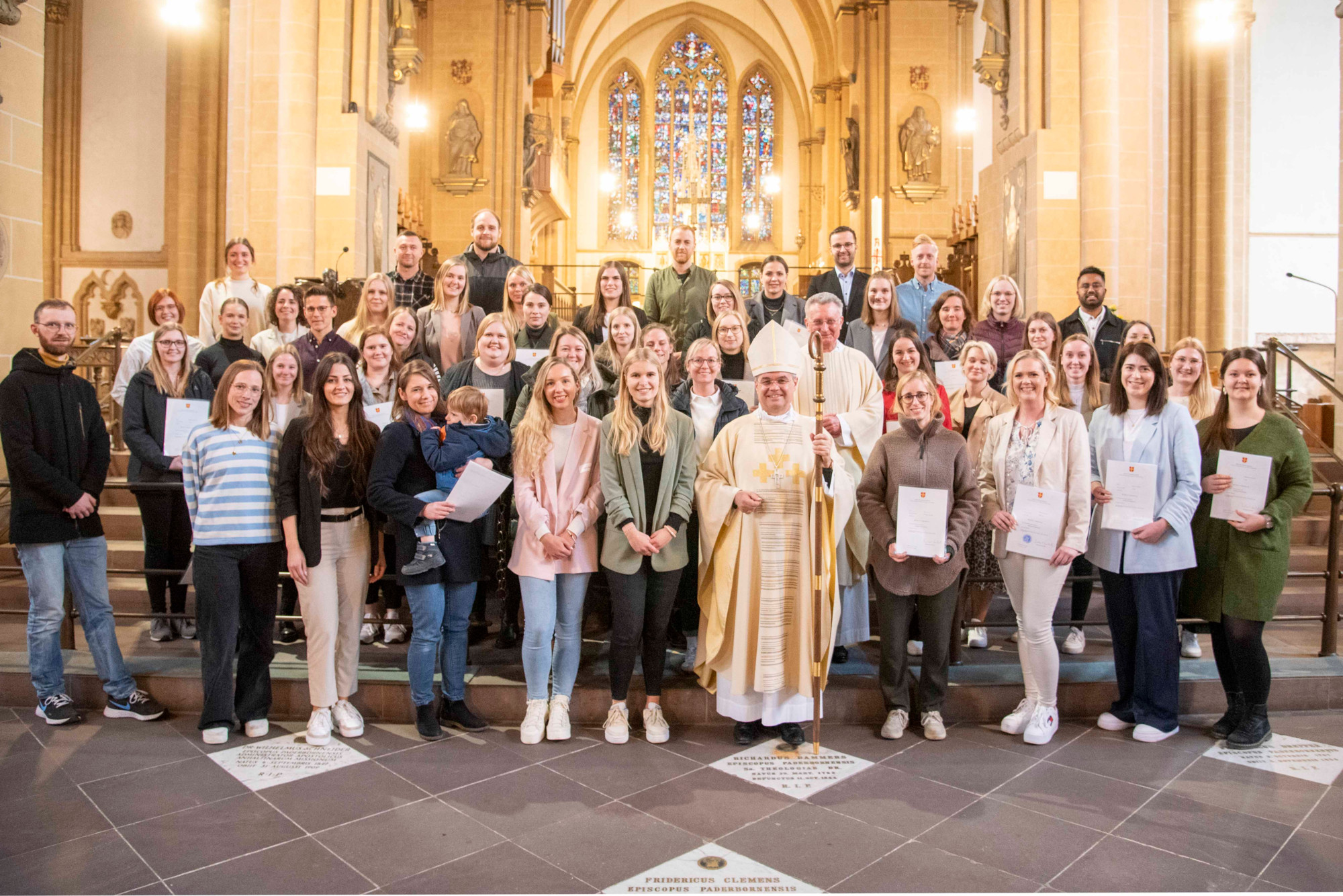 50 Lehrerinnen und Lehrer von verschiedenen Schulen im Erzbistum Paderborn empfingen am Freitag, 26. April 2024, aus den Händen von Erzbischof Dr. Udo Markus Bentz ihre offizielle Beauftragung, zukünftig im Namen der Kirche katholischen Religionsunterricht zu erteilen. Der neue Paderborner Erzbischof überreichte zum ersten Mal Lehrkräften unterschiedlicher Schulformen im Paderborner Dom jeweils eine Urkunde mit der kirchlichen Unterrichtserlaubnis als offizielle Grundlage für ihre Arbeit als Religionslehrerin und Religionslehrer sowie der Missio Canonica, die kirchliche Beauftragung zum Dienst der Verkündigung im katholischen Religionsunterricht.