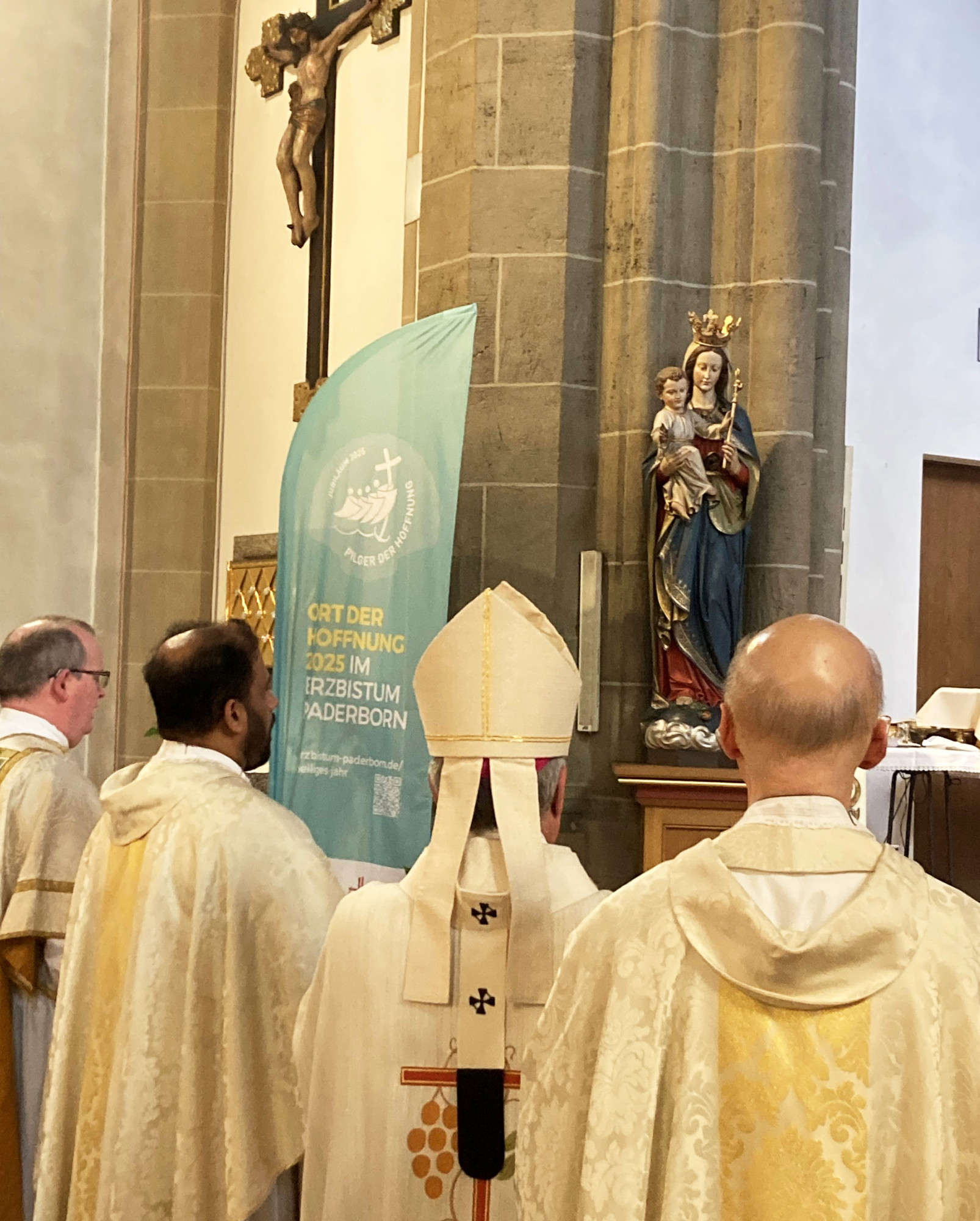 Wenn es darum gehe, die Zuwendung Gottes in der Welt sichtbar zu machen, dann brauche es die Kirche als Anwalt für diese Engel der Hoffnung und als Anwalt für die Würde der Schwachen, unterstrich Erzbischof Dr. Bentz: „Kirche ist überall dort ein Ort der Hoffnung, wo sie sich stark macht für die Schwachen.“ Zum Abschluss seiner Predigt wies Erzbischof Dr. Udo Markus Bentz ausdrücklich auf die Wichtigkeit des Gebets hin: „Zu Engeln der Hoffnung werden wir auch dann, wenn wir einander im Gebet tragen.“