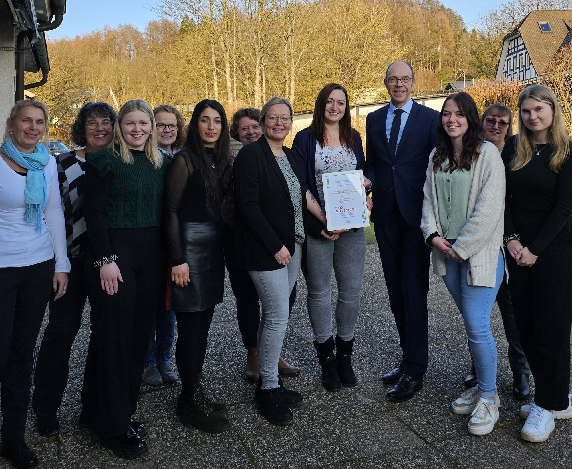 Höhepunkt der Zertifizierung war ein ganztägiges Audit in der Kita St. Barbara, unter der Auditorin Elisabeth Goebel-Krayer. Da die Einrichtungen in einer Matrix zusammenarbeiten, war ein Besuch in Maumke nicht notwendig. Nach dem erfolgreichen Abschlussgespräch erhielten beide Einrichtungen das begehrte Siegel. In Halberbracht steht bereits die nächste Zertifizierung an. „Im Sommer wollen wir uns familienpastoraler Ort rezertifizieren lassen“, verrät Celine Becker.