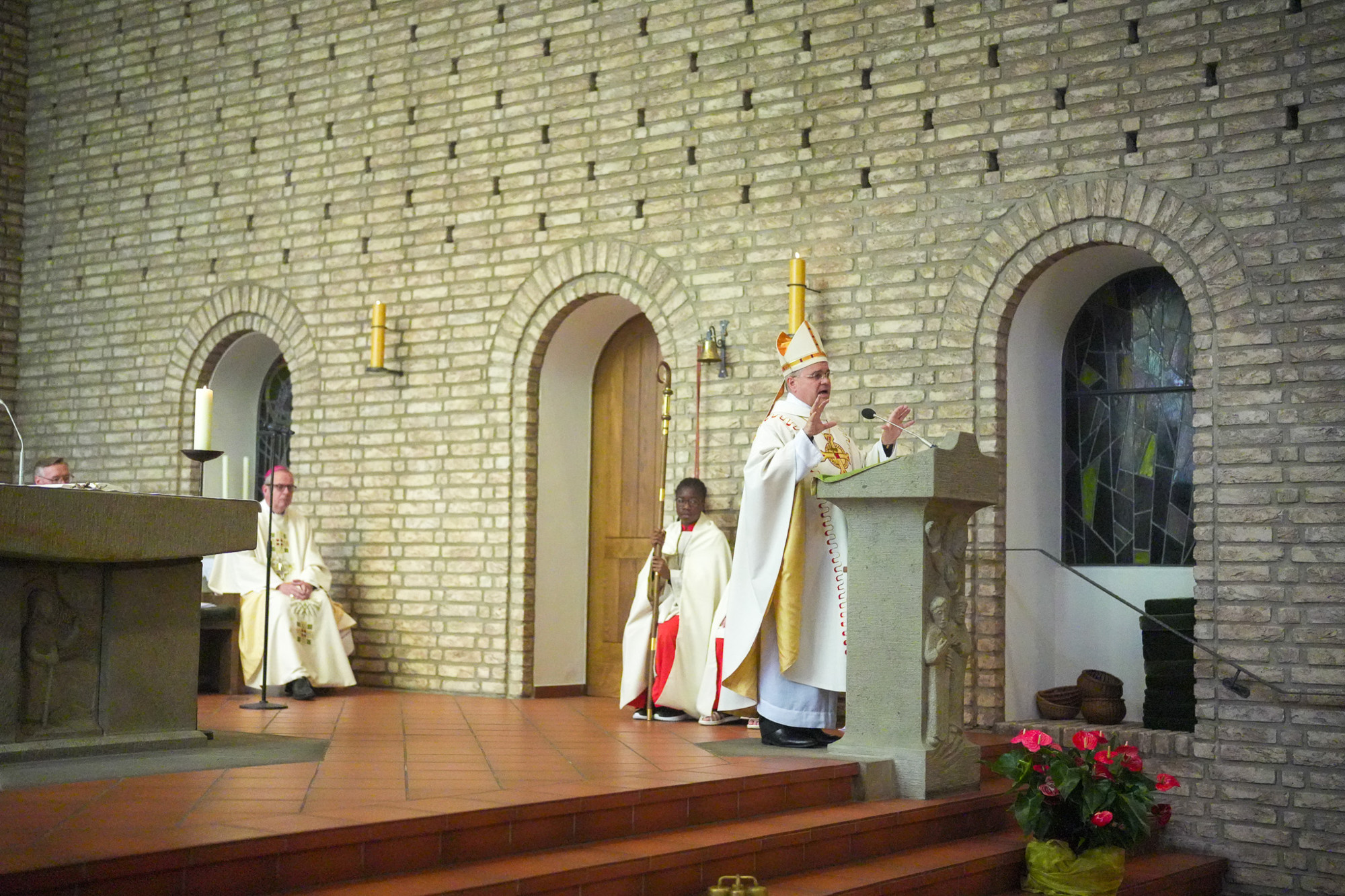 Es ist 17 Uhr. Während sich die Wolken über Lübbecke zusammenziehen, sind die Gläubigen in der St. Baptist Kirche gelassen. Sie haben sich im Gotteshaus versammelt, um gemeinsam mit Erzbischof Dr. Udo Markus Bentz die Eucharistie-Feier zu begehen. Haupt- und Ehrenamtliche sind gekommen, Kinder, Jugendliche und Erwachsene, Gläubige aus den verschiedenen Ortschaften, die diese besonderen Momente mit Erzbischof Dr. Udo Markus Bentz zelebrieren wollen. Gemeinsamkeit und die Liebe zueinander – diese Werte bestimmen auch den heutigen Gottesdienst. In seiner Predigt greift Erzbischof Dr. Udo Markus Bentz den Gedenktag des heiligen Aloisius auf. Aloisius habe sein Leben und Wirken der Liebe zu Gott und den Menschen gewidmet. Aufopferungsvoll kümmerte er sich vor allem um die Kranken, deren Schutzheiliger er noch heute ist. Bei der Pflege Pesterkrankter infizierte er sich und starb schließlich mit gerade einmal 23 Jahren.