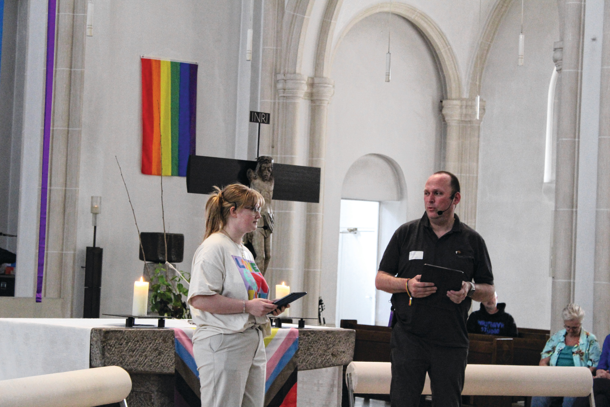 „Ein geschützter Raum für alle“ solle der Gottesdienst sein, betonte der Pastor und Dekanatsjugendseelsorger Martin Blume. Denn QueerGeliebt gab auch die Möglichkeit, persönliche Statements vorzulesen. Daniela nutzte die Gelegenheit. Die heute 40-Jährige lebt mit ihrer Frau und drei Kindern zusammen. Sie versteckt sich nicht, doch das war nicht immer so. Während ihres Theologiestudiums durfte niemand wissen, wen sie liebt. Dann erlebte die getaufte Katholikin in der evangelischen Kirche, wie homosexuelle Paare sich eben nicht verstecken – und war begeistert. Sie fand, wie sie selbst schreibt, „eine neue Heimat“.