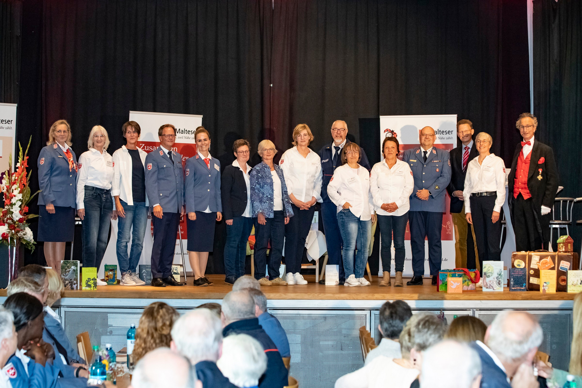 Anschließend kamen die Gottesdienstbesucher mit weiteren Gästen im Kulturzentrum Alte Schmiede zusammen. Rund 130 Personen – bestehend aus Mitarbeitenden, Ehrenamtlichen, Freunden, Förderer, Kooperations- und Netzwerkpartnern – wurden dort feierlich von Butler George (alias Christoph Gilsbach, Performancekünstler, Klinikclown und Moderator) in Empfang genommen. Als besondere Gäste begrüßte Christina Motschull, kommissarische Gesamtleitung der Malteser Hospizdienste, Bürgermeisterin Barbara Brunsing sowie die Malteser Diözesanoberin und stellvertretende Diözesanleiterin Johanna Gräfin von Brühl. Motschull und Brühl dankten in ihren Grußworten vor allem den 100 Ehrenamtlichen; ihre Motivation und ihr Engagement seien die Grundpfeiler der Hospiz- und Trauerarbeit. Seit dem Gründungsjahr wurden in rund 50 Qualifizierungskursen 600 Teilnehmende ausgebildet, die zahlreiche Menschen beim Sterben und in der Trauer begleitet haben.