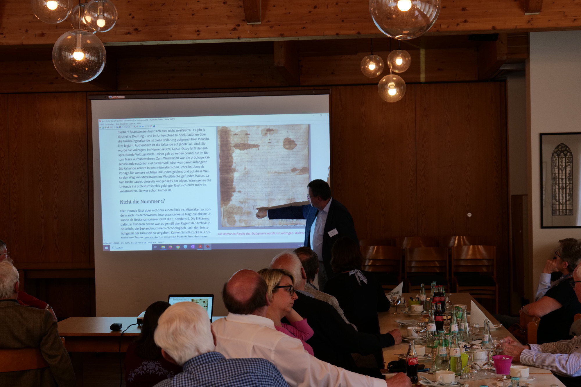 Mit Lothar Rüschenschmidt hat das Wallfahrtszentrum einen ausgewiesenen Kenner der Wallfahrtsgeschichte. Er führte durch die bemerkenswerte Archivaliensammlung. Auf besonderes Interesse stießen die Unterschriften von Kardinal Frings, Bundeskanzler Adenauer und Ministerpräsident Arnold bei der großen Schlesierwallfahrt am 28. Juni 1953. Nach einem Besuch der Propsteikirche St. Walburg konnte die bedeutende Bibliothek in der Propstei besichtigt werden und auch Propst Michael Feldmann ließ es sich nicht nehmen, die Archivarinnen und Archivare in seiner humorvollen Art zu begrüßen.