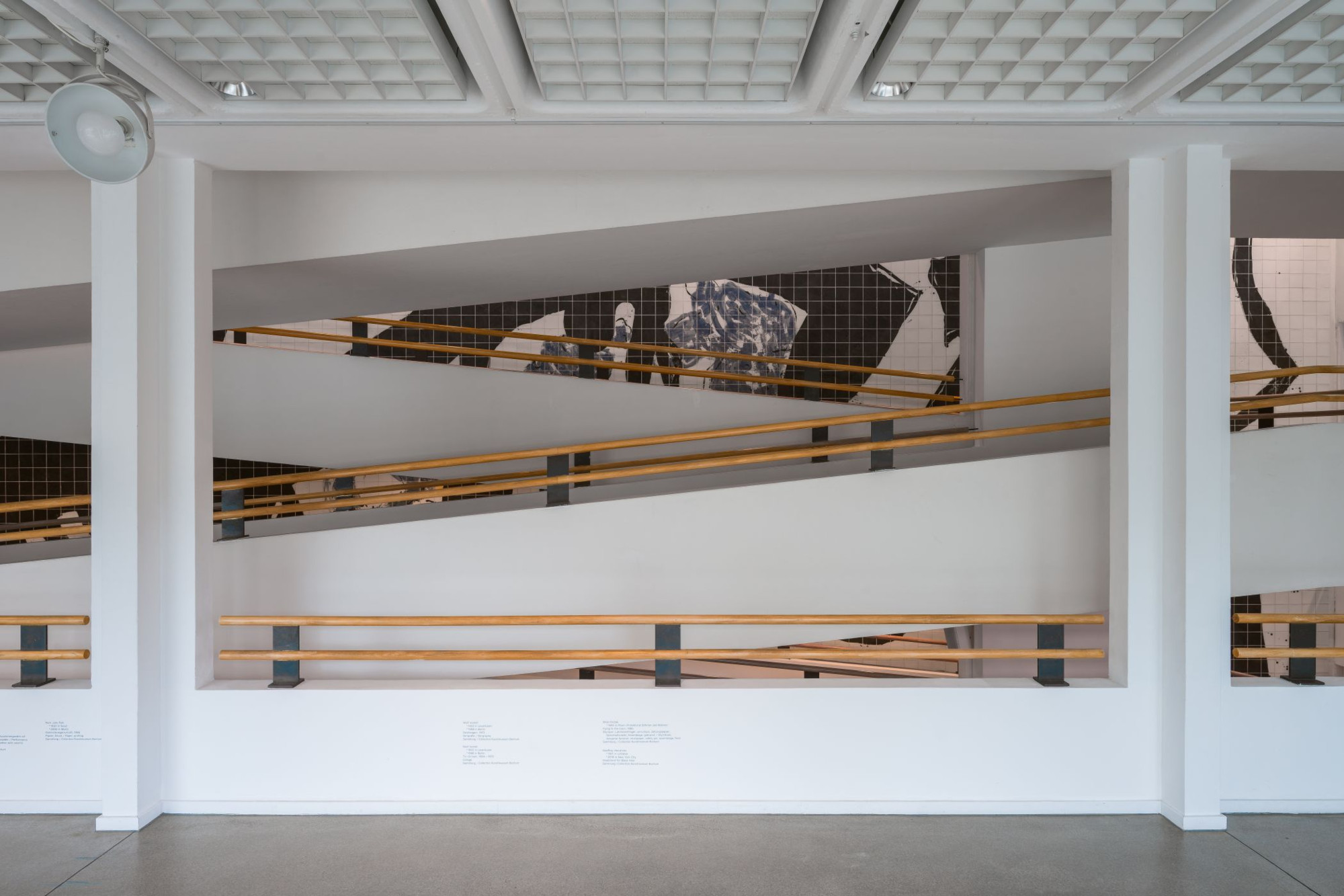 Bereits während der Planungsphase erstellten Künstlerinnen und Künstler Entwürfe, um ein optimales Zusammenspiel von Architektur und wandfester Kunst zu erreichen. Besonders auffallend sind die Plexiglasgestaltung von Terry Haas an der hauseigenen Bibliothek und die Porzellanfliesenwand von Mogens Andersen. Letztere wurde bereits vor dem Einbau der Rampe angebracht und ist nur in Ausschnitten zu sehen. Weitere wandfeste Kunstwerke nehmen Flächen und Räume ein, die nicht für Exponate geeignet sind. Das Museum wurde somit zum Gesamtkunstwerk.