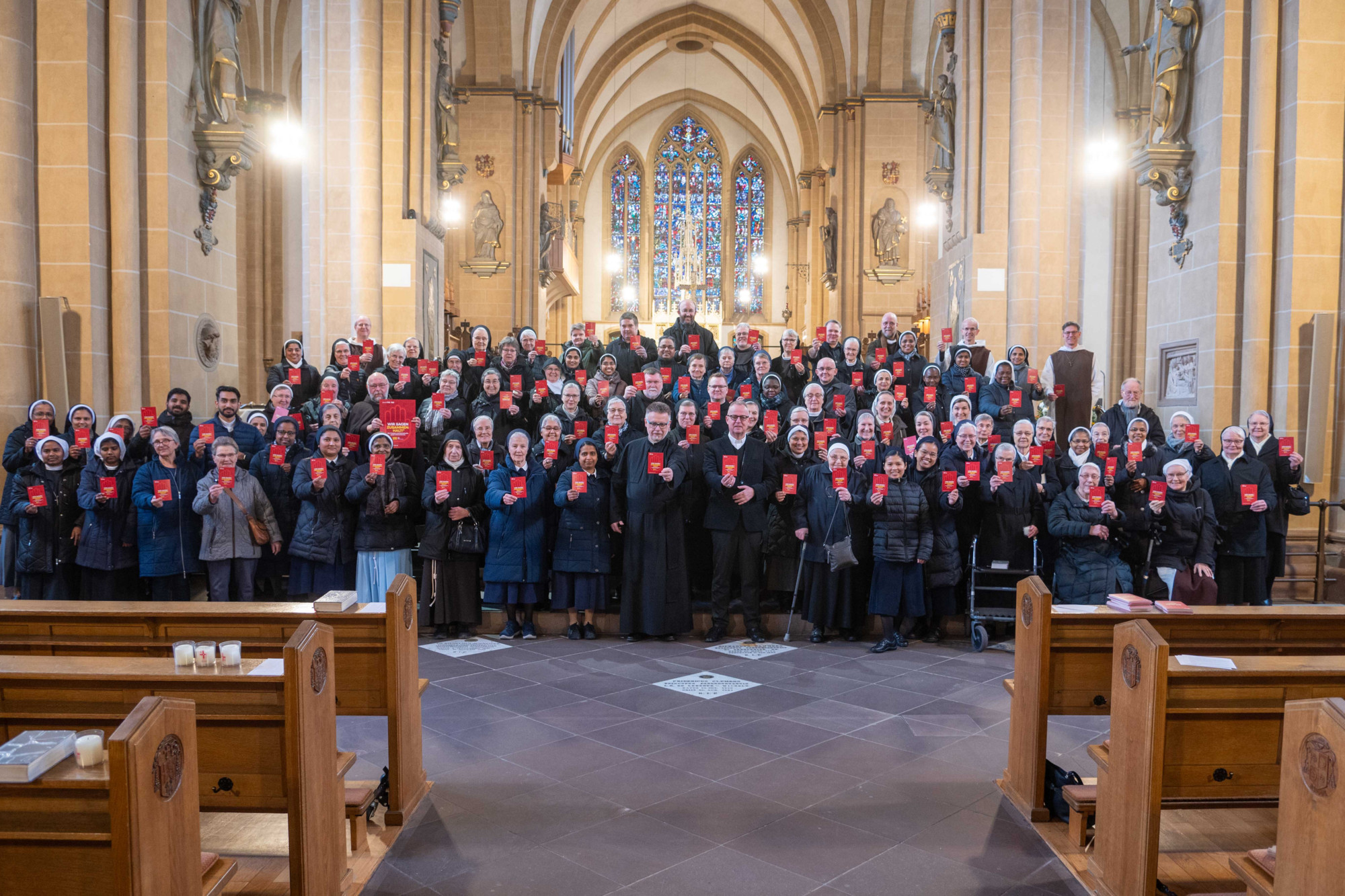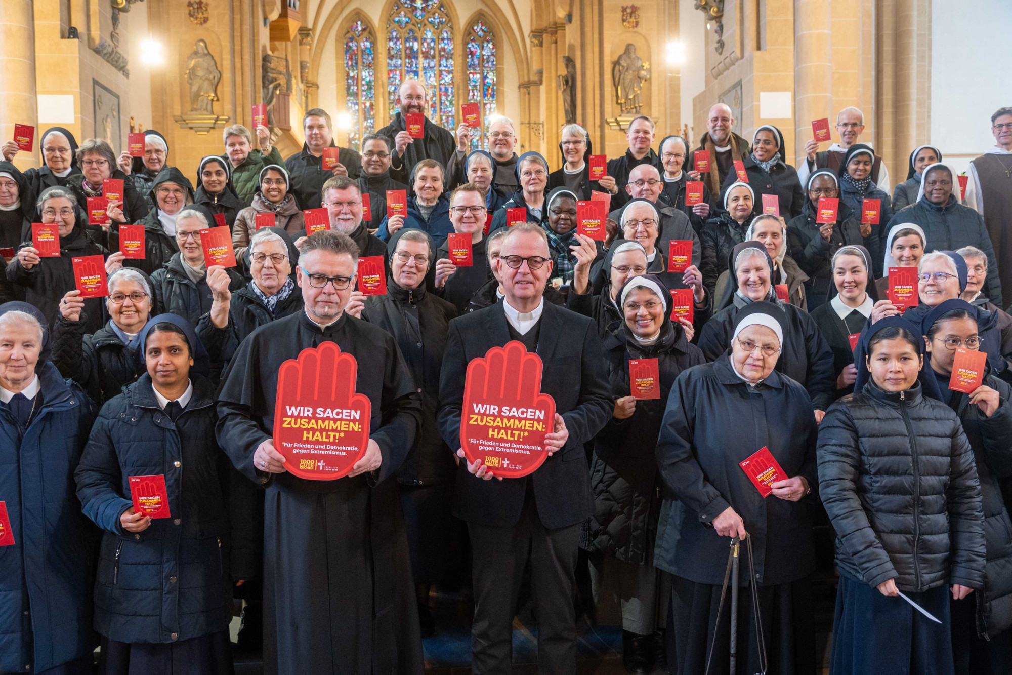 Ordens-Christen, Frauen und Männer des geweihten Lebens aus dem ganzen Erzbistum sowie Weihbischof Josef Holtkotte unterstützen mit Nachdruck die Initiative des Erzbistums Paderborn „WIR SAGEN ZUSAMMEN:HALT! Für Frieden und Demokratie, gegen Extremismus“: Bei einer Zusammenkunft im Paderborner Dom hoben 150 Schwestern und Brüder aus den unterschiedlichen Ordensgemeinschaften und geistlichen Gemeinschaften des Erzbistums eine Kampagnenkarte und setzten so mit Weihbischof Holtkotte ein eindrucksvolles Gemeinschafts-Zeichen für Zusammenhalt und gegen Extremismus.