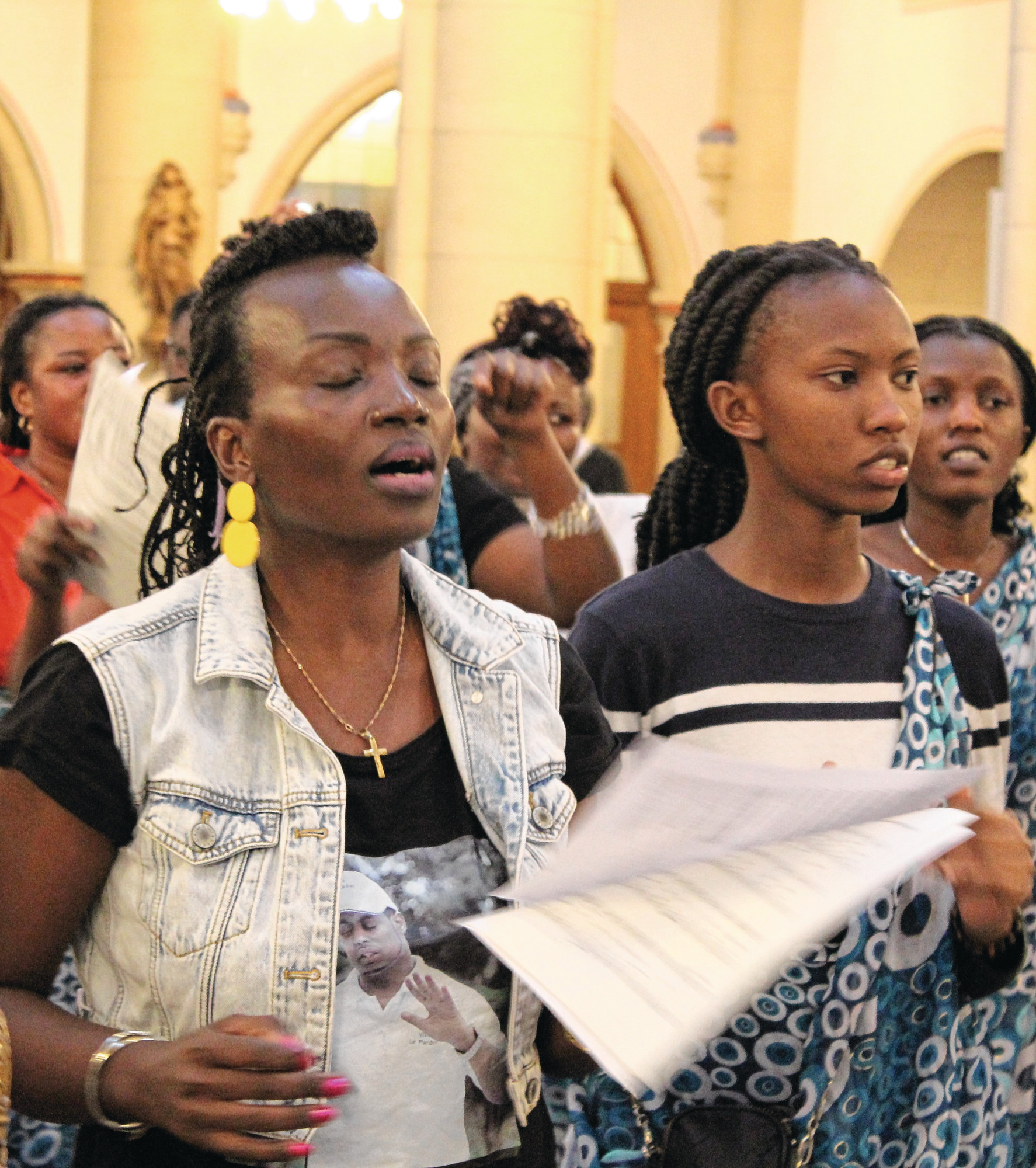 Sie wiegen sich zur Musik, dann treten zwei Sängerinnen nach vorne. Ihre Arme heben und senken sich, sie scheinen völlig versunken zu sein, während die anderen Sängerinnen und Sänger der Gruppe „Kizito Mihigo für Frieden und Versöhnung“ immer weiter ihre Texte singen. Es sind ungewöhnliche Töne, die während der Gottesdienste am Afrikawochenende in der Kirche St. Franziskus zu hören waren. Doch sie lassen niemanden unberührt. Schnell hat die Gruppe, deren Mitglieder alle Wurzeln in Ruanda haben, die Gläubigen in ihren Bann gezogen.