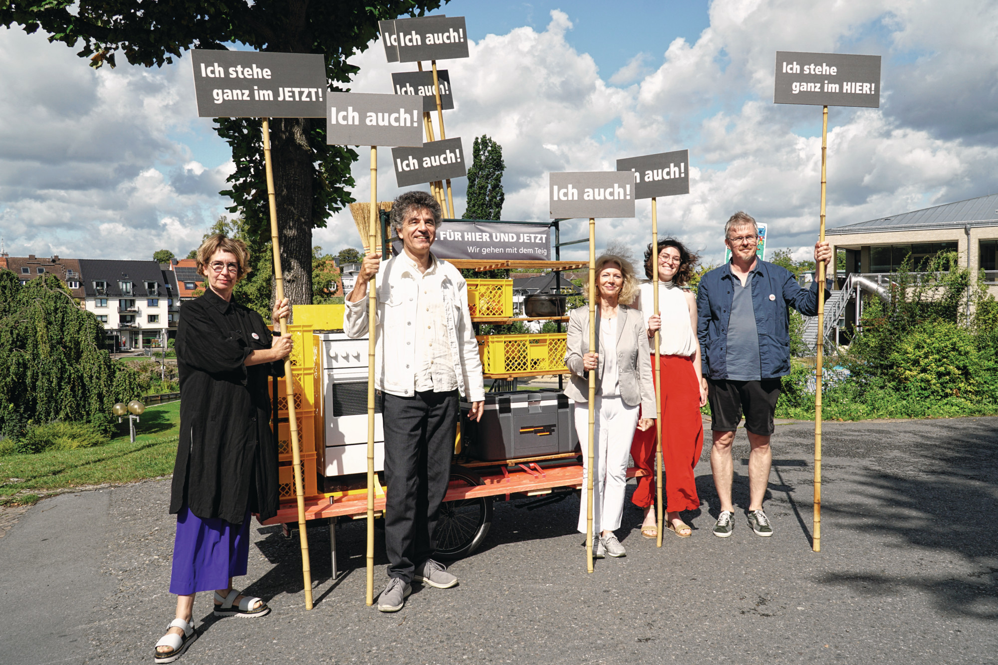 Das MOBIL FÜR HIER UND JETZT bewegt sich gemächlich, aber gut sichtbar durch das Zentrum der Stadt, umkreist Orte, geht Umwege oder lässt sich auf Plätzen nieder. Gemeinsam mit einem Publikum, das das Hier und Jetzt sucht, wird das Einfache getan. Auf einer etwas anderen Prozession wird langsam gegangen, für das Hier und Jetzt demonstriert und im Flüsterchor gesprochen. Der Teig diktiert die Pausen. Der Verzehr des frischen Brotes beschließt jeweils die verlangsamten Tage.