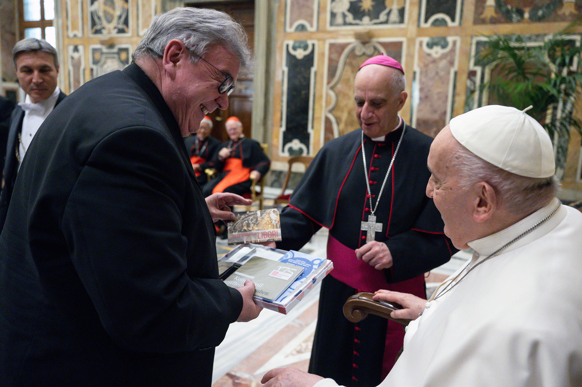 Gesprochen wurde in diesem Zusammenhang zum Beispiel über Pilgerorte und Pilgerwege. An diesen geschichtlichen Orte werde erfahrbar, dass Gott dort gewirkt hat. „Menschen machen sich auf den Weg und haben nicht nur den Weg unter den Füßen, sondern erleben Gemeinschaft. Sie kommen mit dem Glauben in Berührung und stellen Lebensfragen“, erklärt Monsignore Austen, der dem Papst bei der Audienz im Namen des Bonifatiuswerkes das neue, von ihm herausgegebene Buch „Entdecke, wer dich stärkt“, eine Bonifatius-Glasstele sowie eine Libori-Tusch-Klappkarte als Geschenk überreichte, die den Tusch hörbar abspielt. Dies sorgte für Aufmerksamkeit und ein Schmunzeln bei Papst Franziskus.