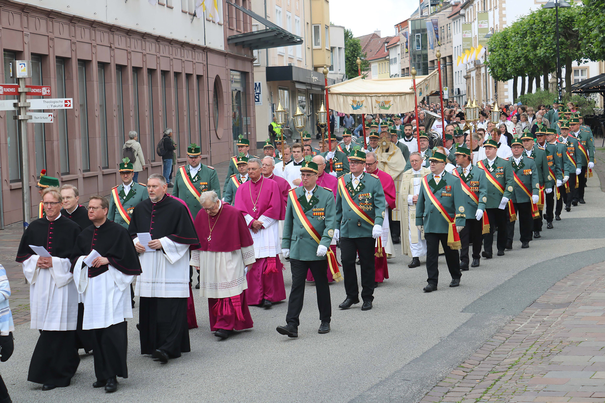 In der Tat waren es mehrere Aspekte, die diesen Gedanken sichtbar werden ließen. Traditionell machten sich wieder zahlreiche Schützen lokaler Vereine mit auf den Weg durch die Innenstadt. Und auch der Paderborner Bürgermeister Michael Dreier wohnte dem Gottesdienst und der Prozession bei. Diese machte zunächst vor der Universitäts- und Marktkirche Halt – hier sprach und betete Domkapitular Msgr. Prof. Dr. Rüdiger Althaus. Dann ging es vorbei am Historischen Rathaus und der Stadthaus-Baustelle zur Abdinghofkirche. Hier wurde ein weiteres Miteinander deutlich, denn die Evangelische Kirche hatte ihren Kirchplatz für die Prozession zur Verfügung gestellt. An diesem Ort richtete Domkapitular Benedikt Fischer Worte an die Teilnehmenden und formulierte Bitten, die zur Prozession dazugehören.