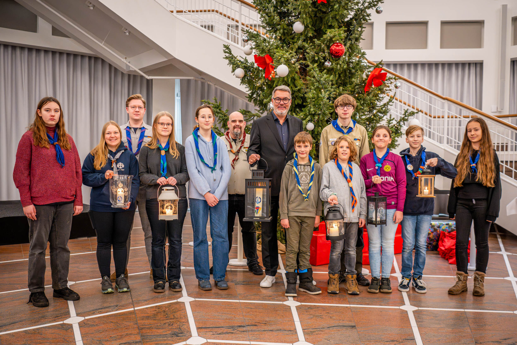 Seit Donnerstagabend (19. Dezember) brennt das Friedenslicht aus Bethlehem auch im Dortmunder Rathaus. Eine Gruppe Pfadfinderinnen und Pfadfinder brachten die Laterne mit dem Friedenslicht in das Rathaus und übergaben die Flamme an Oberbürgermeister Thomas Westphal.